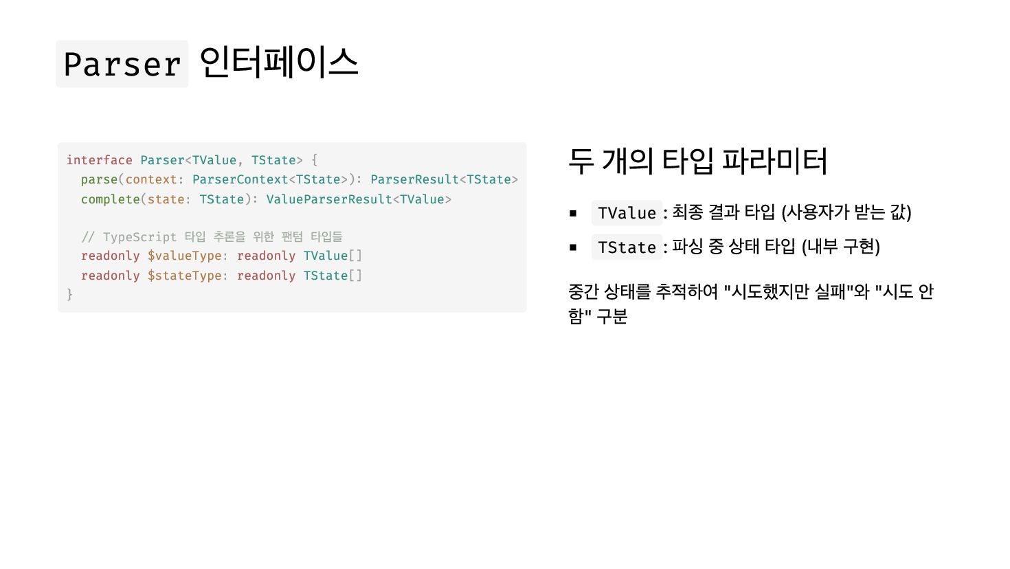 >): < > ( : ): < > // TypeScript 타입 추론을 위한 팬텀 타입들 readonly : readonly [] readonly : readonly [] } 두 개의 타입 파라미터 TValue : 최종 결과 타입 (사용자가 받는 값) TState : 파싱 중 상태 타입 (내부 구현) 중간 상태를 추적하여 "시도했지만 실패"와 "시도 안 함" 구분 Parser TValue TState parse context ParserContext TState ParserResult TState complete state TState ValueParserResult TValue $valueType TValue $stateType TState