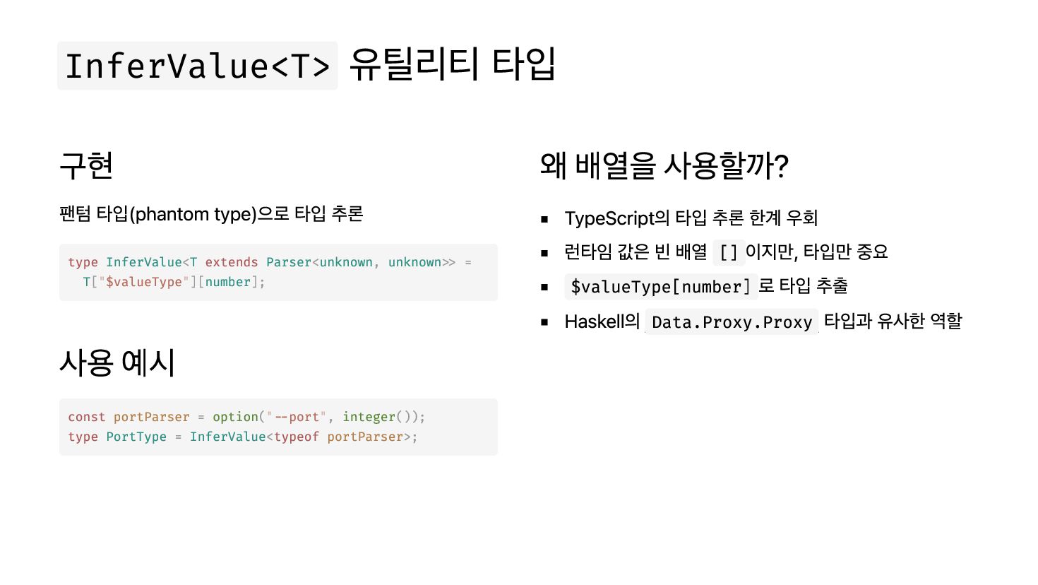 예시 왜 배열을 사용할까? TypeScript의 타입 추론 한계 우회 런타임 값은 빈 배열 [] 이지만, 타입만 중요 $valueType[number] 로 타입 추출 Haskell의 Data.Proxy.Proxy 타입과 유사한 역할 type < extends <unknown, unknown>> = ["$valueType"][number]; InferValue T Parser T const = ("--port", ()); type = <typeof >; portParser option integer PortType InferValue portParser