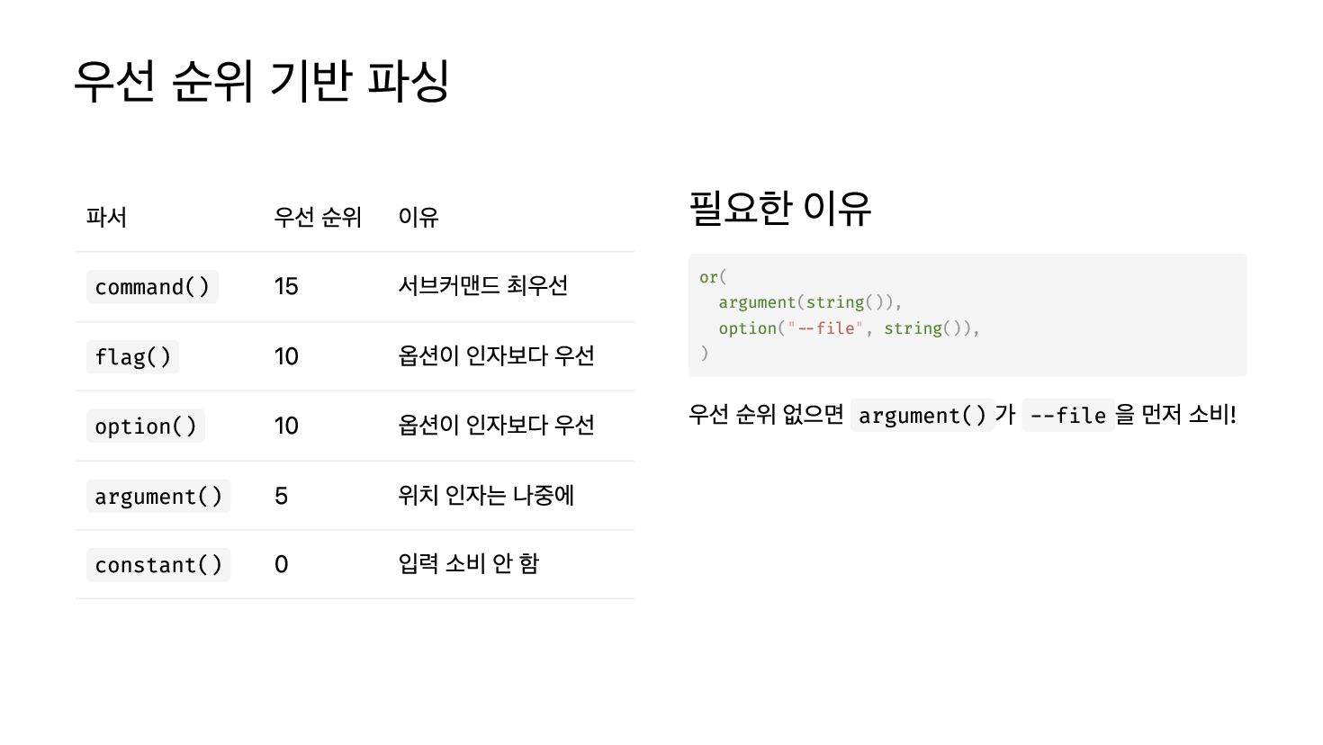 서브커맨드 최우선 flag() 10 옵션이 인자보다 우선 option() 10 옵션이 인자보다 우선 argument() 5 위치 인자는 나중에 constant() 0 입력 소비 안 함 필요한 이유 ( ( ()), ("--file", ()), ) 우선 순위 없으면 argument() 가 --file 을 먼저 소비! or argument string option string