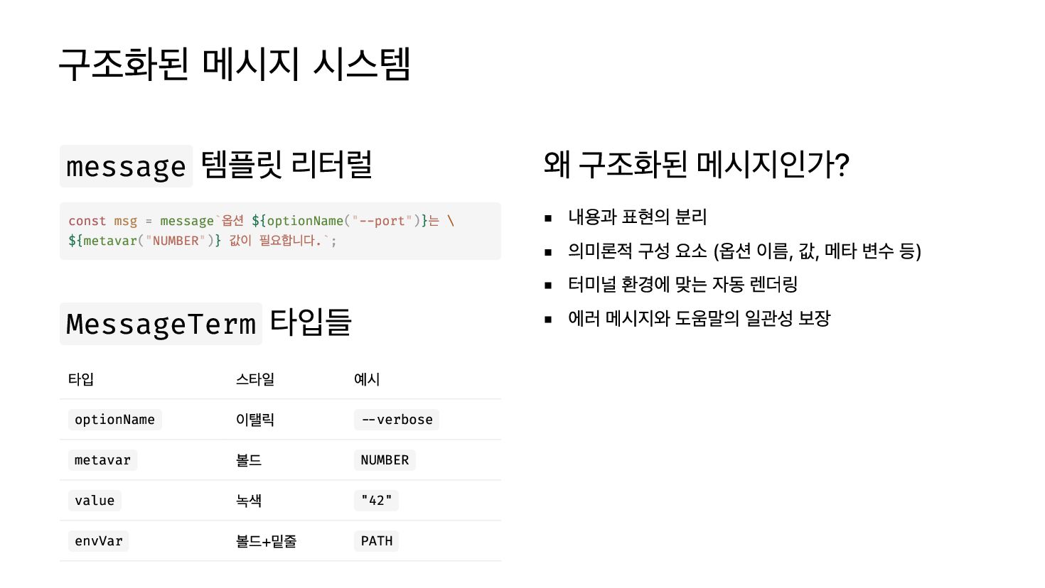 ("--port")}는 \ ${ ("NUMBER")} 값이 필요합니다.`; MessageTerm 타입들 타입 스타일 예시 optionName 이탤릭 --verbose metavar 볼드 NUMBER value 녹색 "42" envVar 볼드+밑줄 PATH 왜 구조화된 메시지인가? 내용과 표현의 분리 의미론적 구성 요소 (옵션 이름, 값, 메타 변수 등) 터미널 환경에 맞는 자동 렌더링 에러 메시지와 도움말의 일관성 보장 msg message optionName metavar