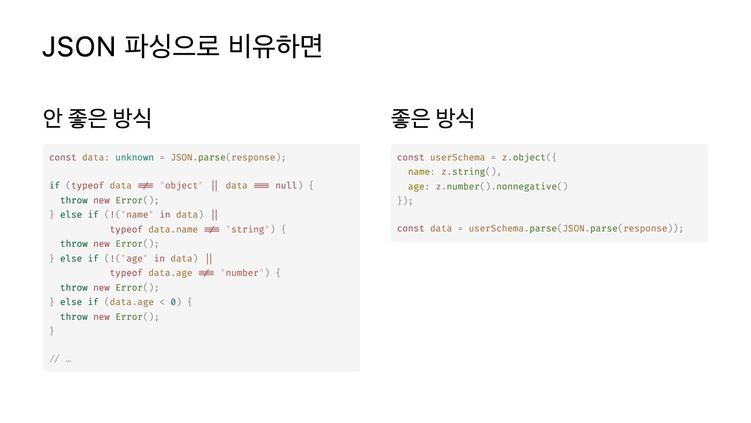 unknown = . ( ); if (typeof !== "object" || === null) { throw new (); } else if (!("name" in ) || typeof . !== "string") { throw new (); } else if (!("age" in ) || typeof . !== "number") { throw new (); } else if ( . < 0) { throw new (); } // … data JSON parse response data data Error data data name Error data data age Error data age Error const = . ({ : . (), : . (). () }); const = . ( . ( )); userSchema z object name z string age z number nonnegative data userSchema parse JSON parse response