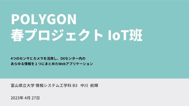 POLYGON 春プロジェクト IoT班 4つのセンサとカメラを活用し、DXセンター内の あらゆる情報を1つにまとめたWebアプリケーション 2023年 4月 27日 富山県立大学 情報システム工学科