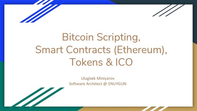 various blockchain platforms. Developed by Gavin Wood, Christian Reitwiessner, Alex Beregszaszi, Yoichi Hirai and several former Ethereum core contributors to enable writing smart contracts on blockchain platforms such as Ethereum. • Turing complete • Based around ECMAScript syntax but statically typed • Runs on Ethereum Virtual Machine (EVM) • Compiles to bytecode before execution • Gas units used to fuel execution (paid by senders of transaction to miners in ether) • Gases prevent deliberate attacks and abuse on the Ethereum network • Still open to DoS attack by infinite loop but attacker should fund the DoS