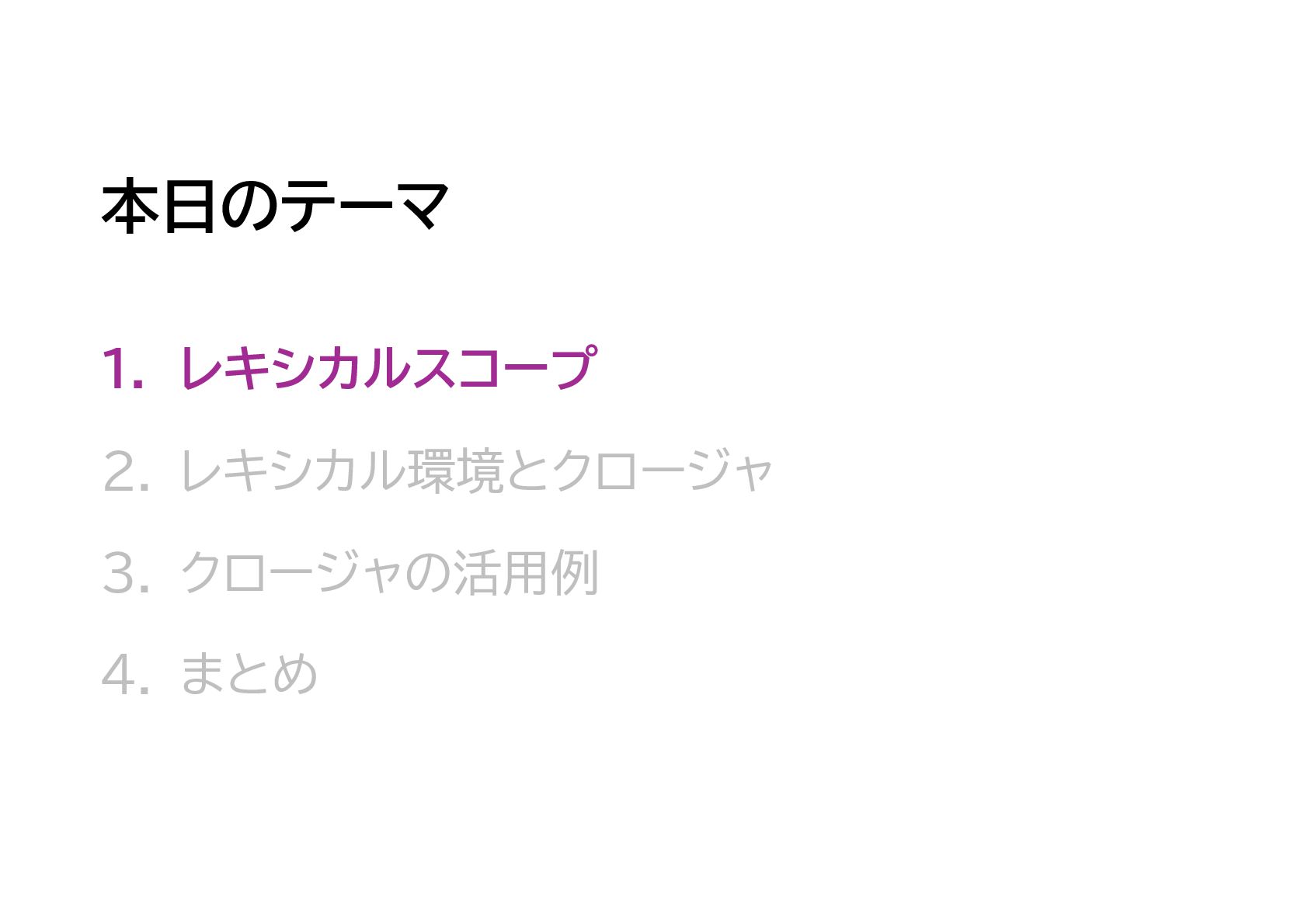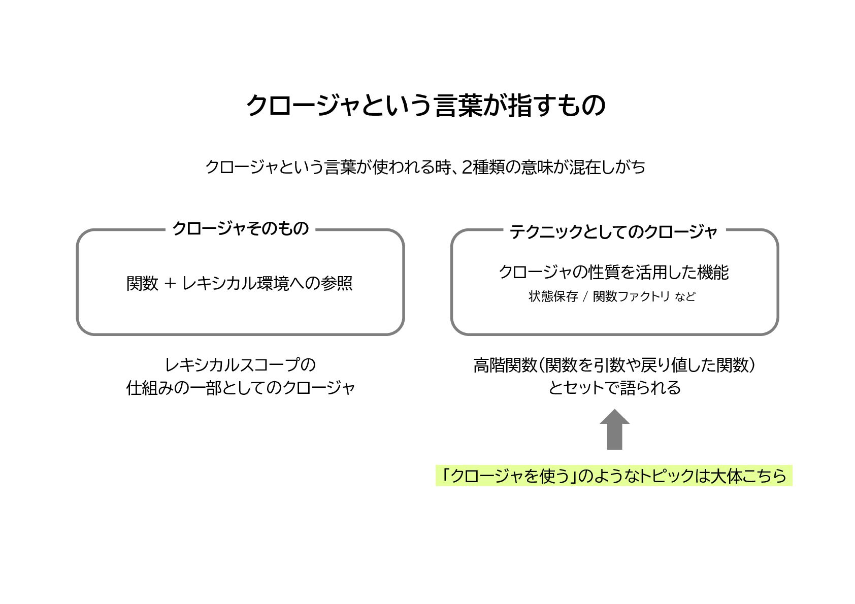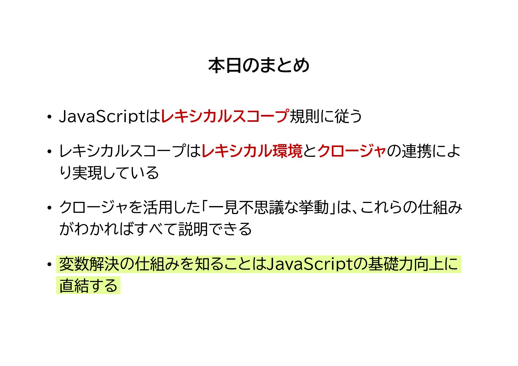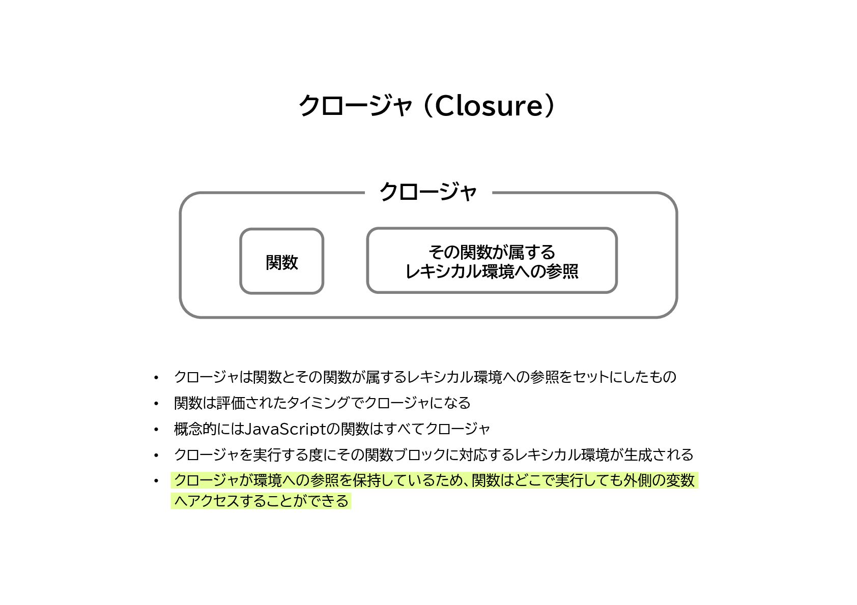 JavaScriptのスコープ規則である「レキシカルスコープ」、そしてそのレキシカルスコープの内部機構である、レキシカル環境とクロージャについてのまとめです。
