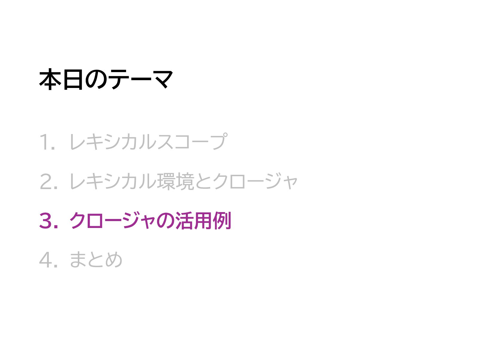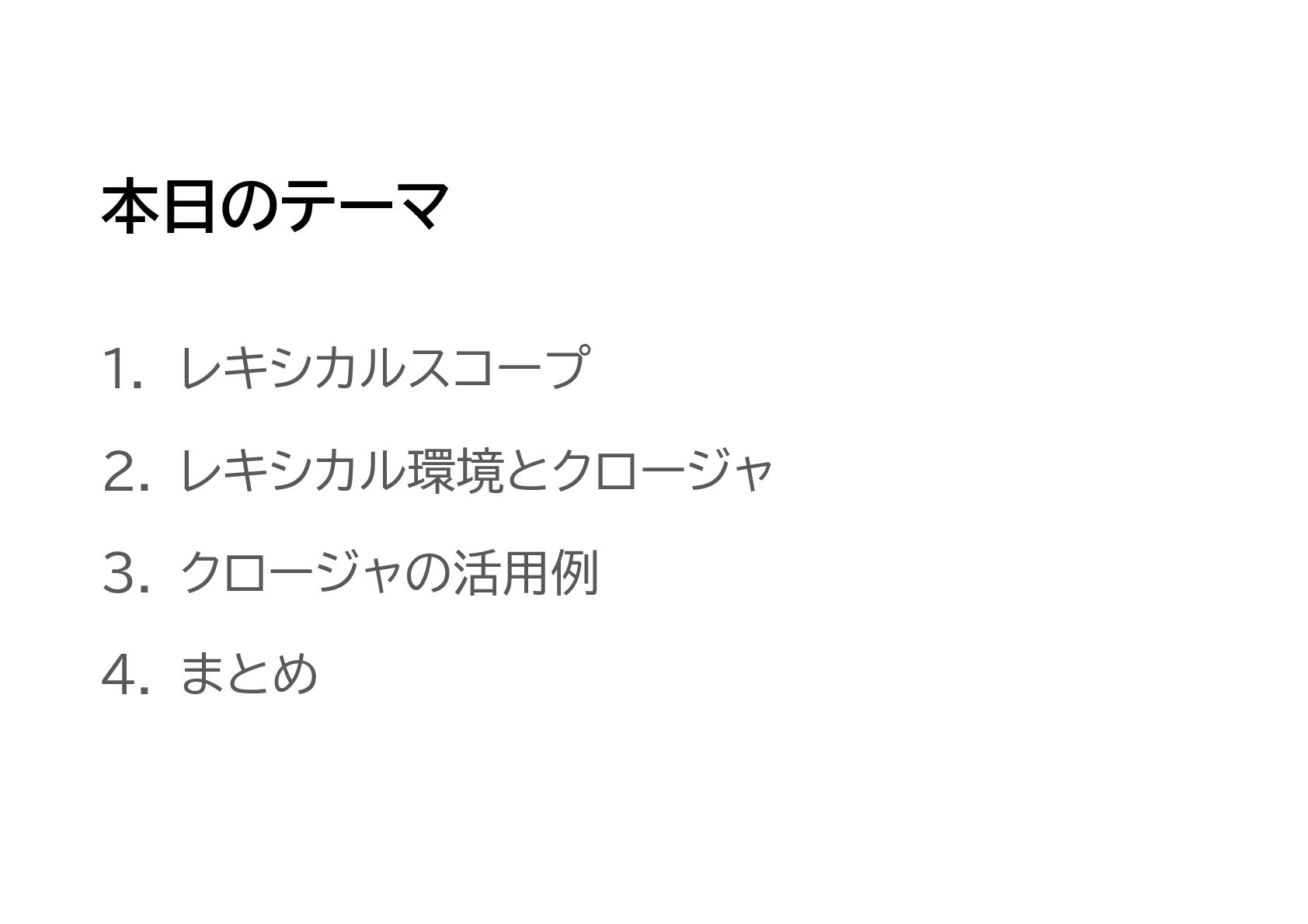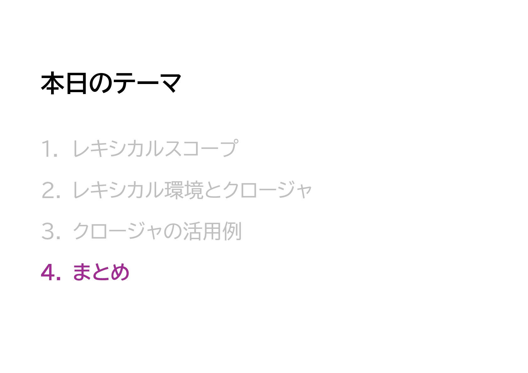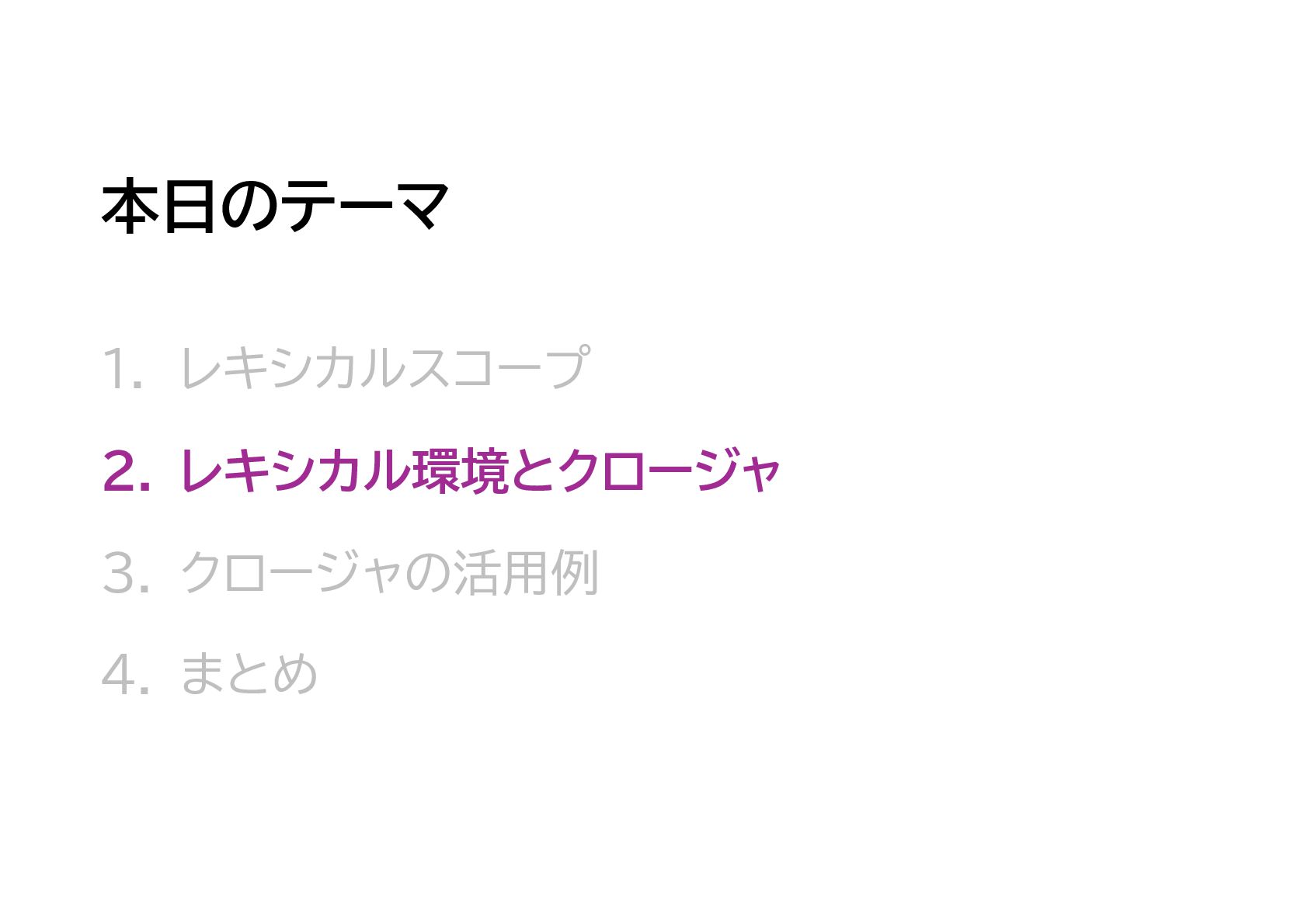 JavaScriptのスコープ規則である「レキシカルスコープ」、そしてそのレキシカルスコープの内部機構である、レキシカル環境とクロージャについてのまとめです。