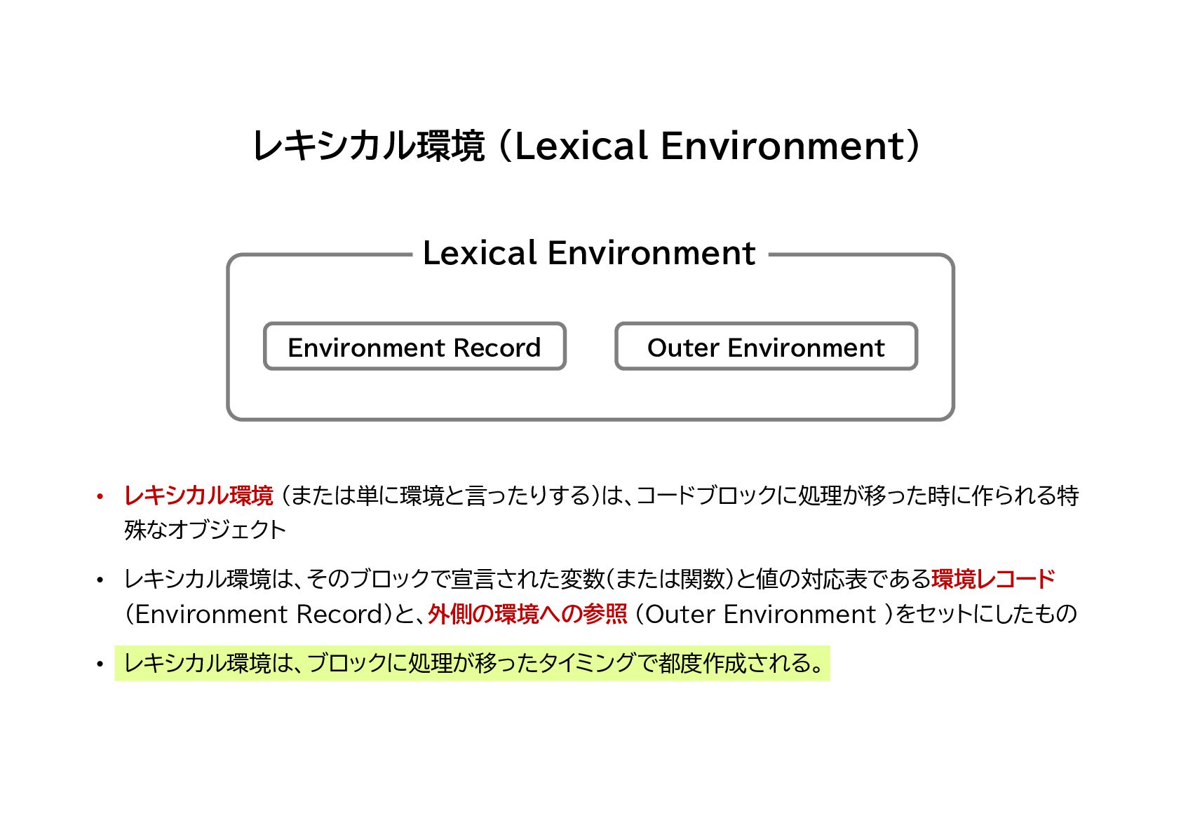 Record)と、外側の環境への参照 (Outer Environment )をセットにしたもの • レキシカル環境は、ブロックに処理が移ったタイミングで都度作成される。 Lexical Environment Environment Record Outer Environment
