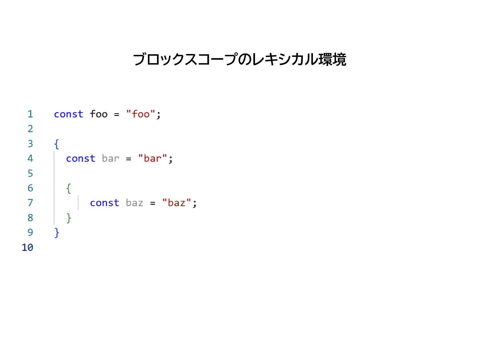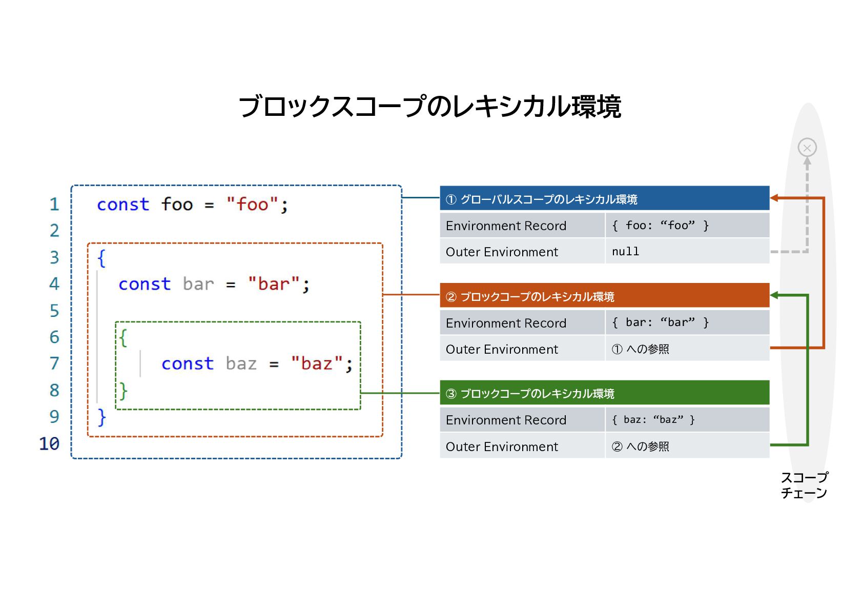 Environment ② ブロックコープのレキシカル環境 { bar: “bar” } Environment Record ① への参照 Outer Environment ③ ブロックコープのレキシカル環境 { baz: “baz” } Environment Record ② への参照 Outer Environment × スコープ チェーン ブロックスコープのレキシカル環境
