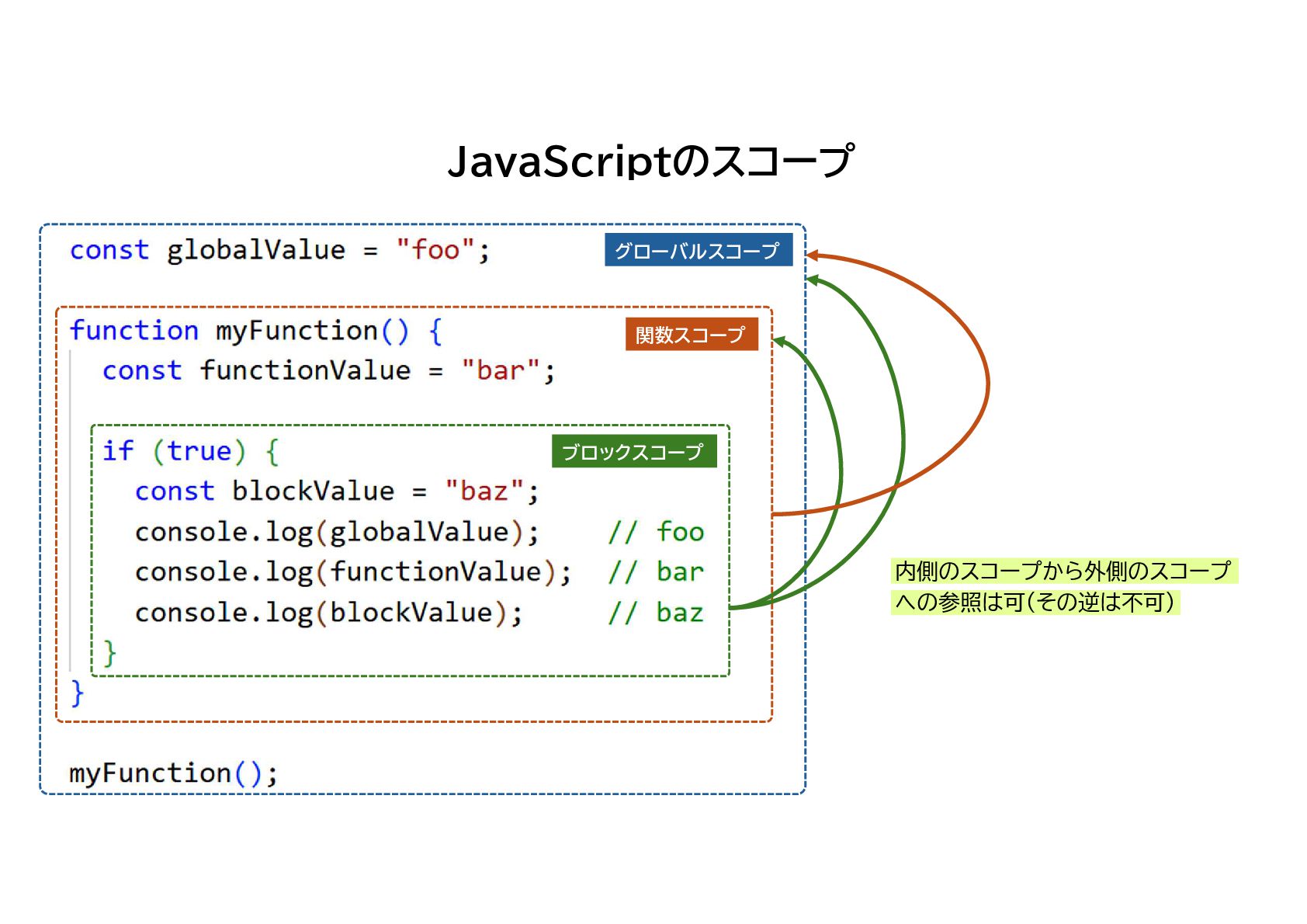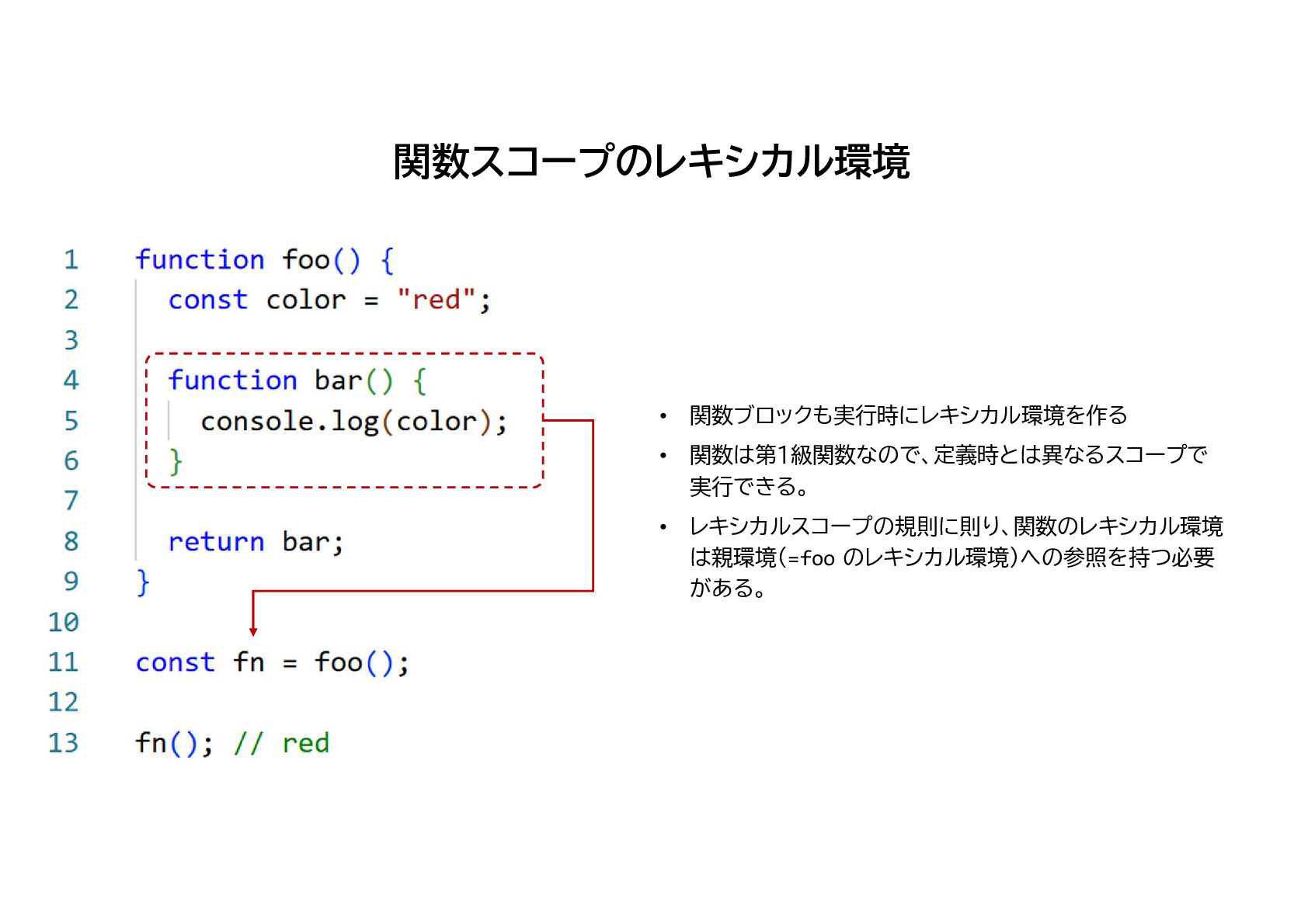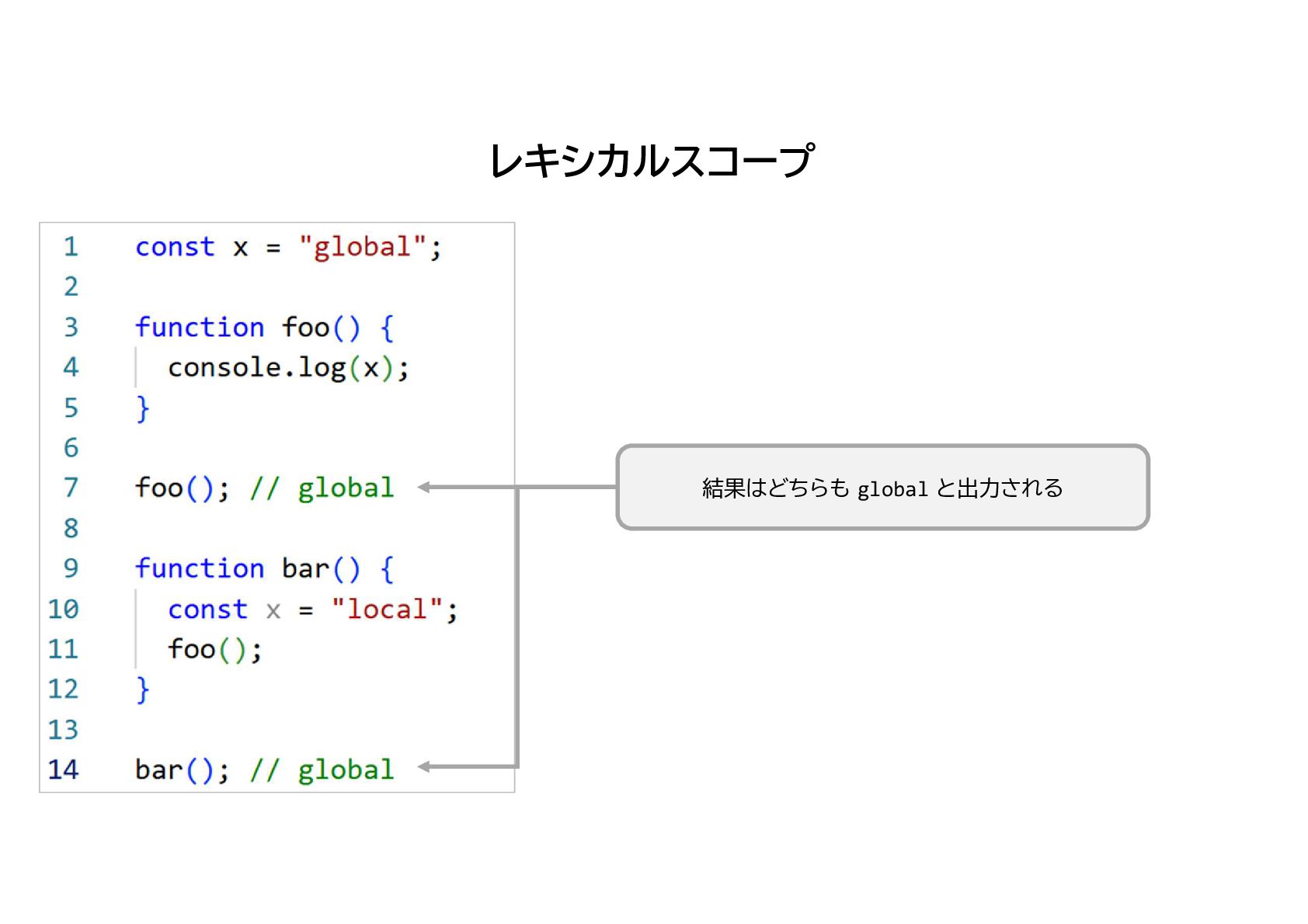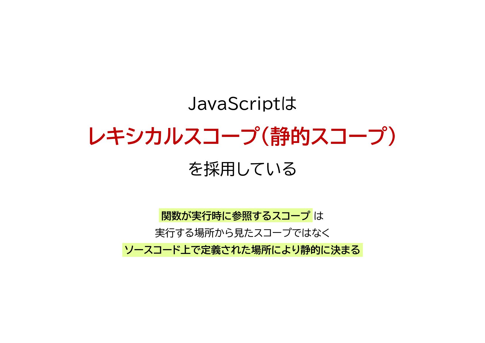 レキシカルスコープ なので、関数から見たスコープはコード上 の位置によって静的に決定される 関数はどこにでも持ち出せるが あくまで定義場所から見たスコープで実行される