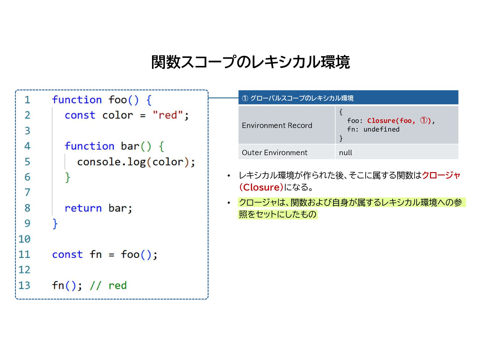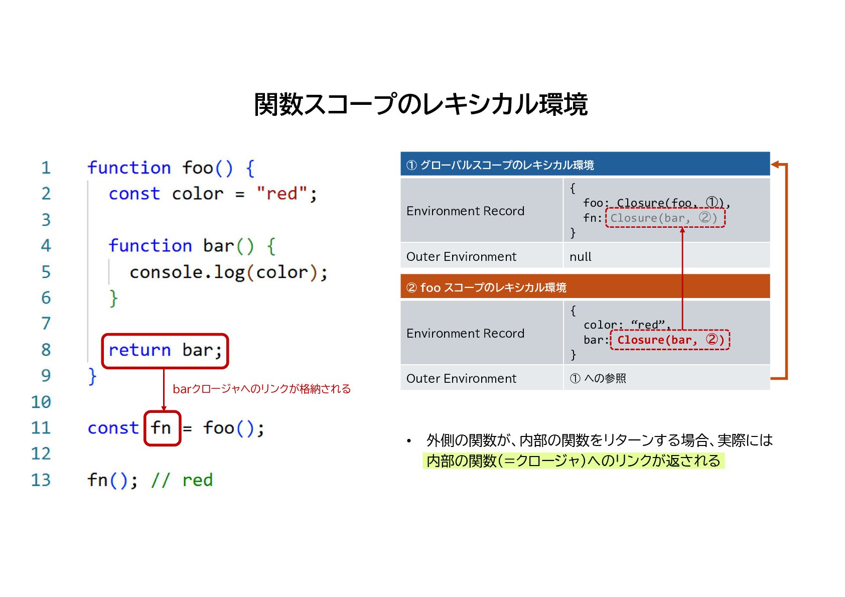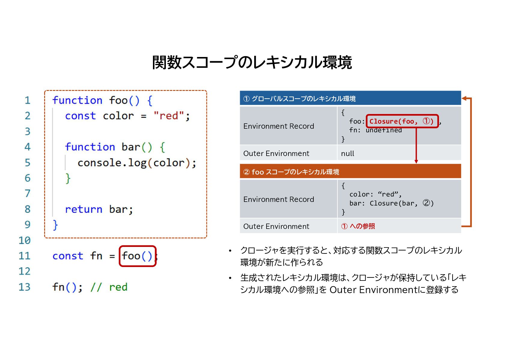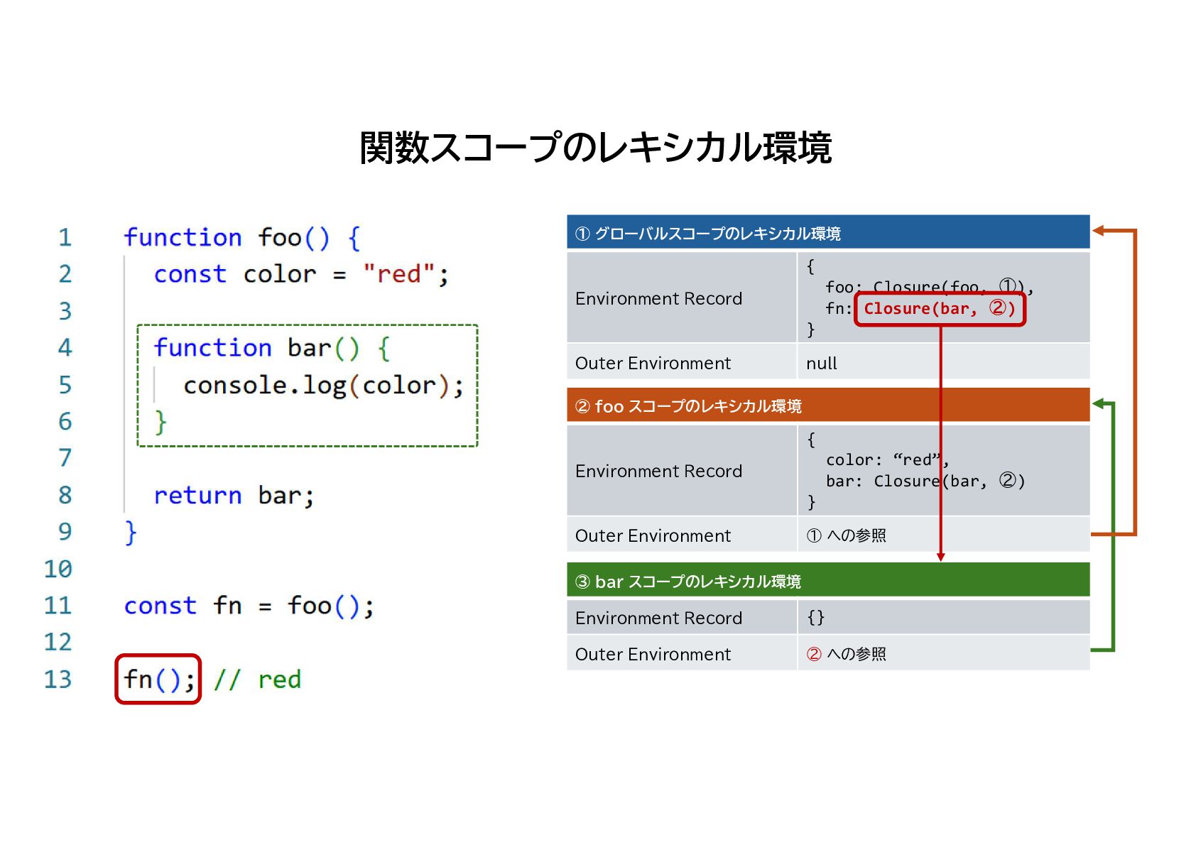 foo: Closure(foo, ①), fn: Closure(bar, ②) } Environment Record null Outer Environment ② foo スコープのレキシカル環境 { color: “red”, bar: Closure(bar, ②) } Environment Record ① への参照 Outer Environment ③ bar スコープのレキシカル環境 {} Environment Record ② への参照 Outer Environment