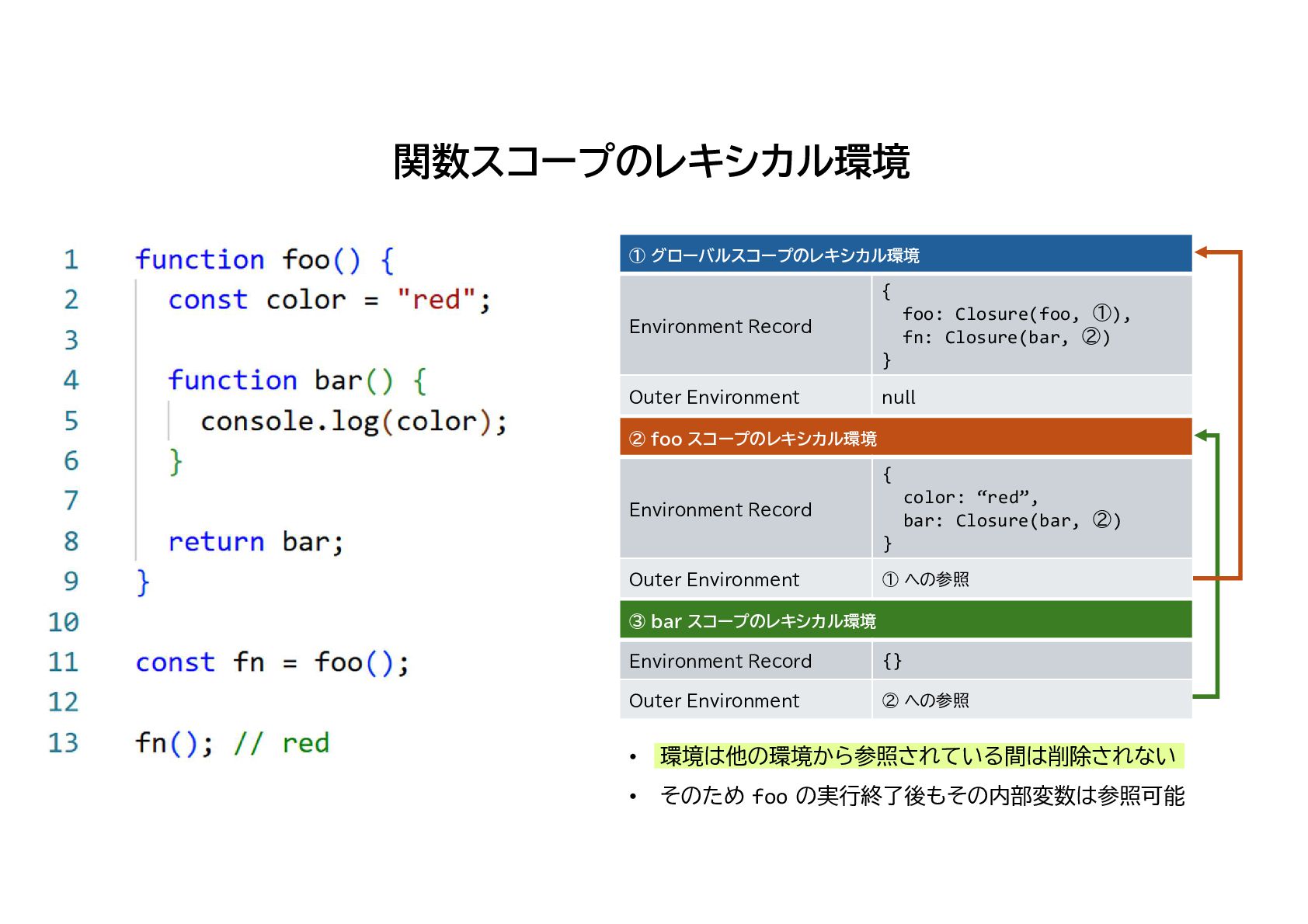 11. • 環境は他の環境から参照されている間は削除されない • そのため foo の実行終了後もその内部変数は参照可能 関数スコープのレキシカル環境 ① グローバルスコープのレキシカル環境 {