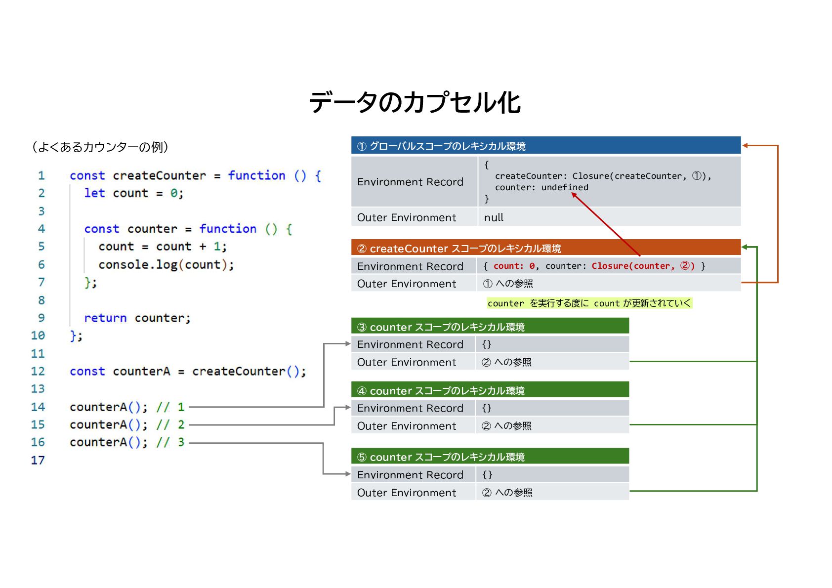 Environment Record null Outer Environment ② createCounter スコープのレキシカル環境 { count: 0, counter: Closure(counter, ②) } Environment Record ① への参照 Outer Environment ③ counter スコープのレキシカル環境 {} Environment Record ② への参照 Outer Environment ④ counter スコープのレキシカル環境 {} Environment Record ② への参照 Outer Environment ⑤ counter スコープのレキシカル環境 {} Environment Record ② への参照 Outer Environment counter を実行する度に count が更新されていく (よくあるカウンターの例)