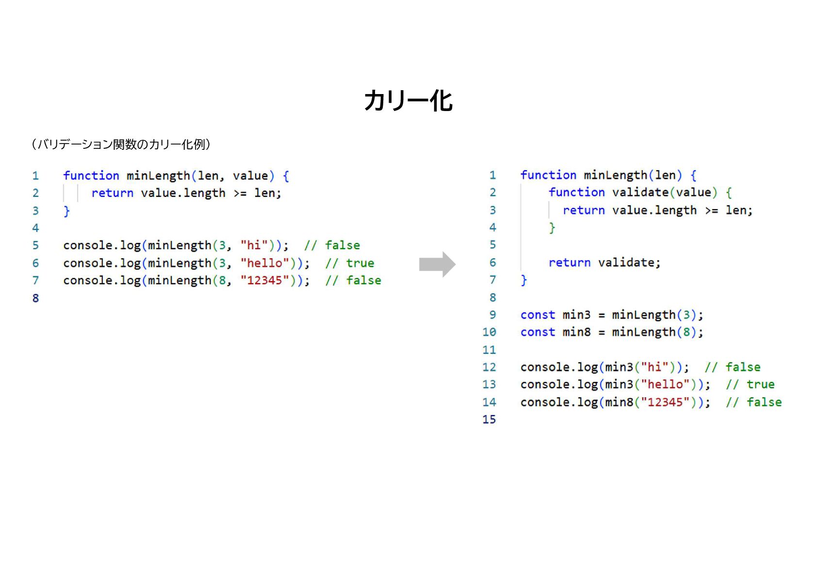13. カリー化 (バリデーション関数のカリー化例) ① グローバルスコープのレキシカル環境 { minLength: Closure(minLength, ①), min3: undefined,