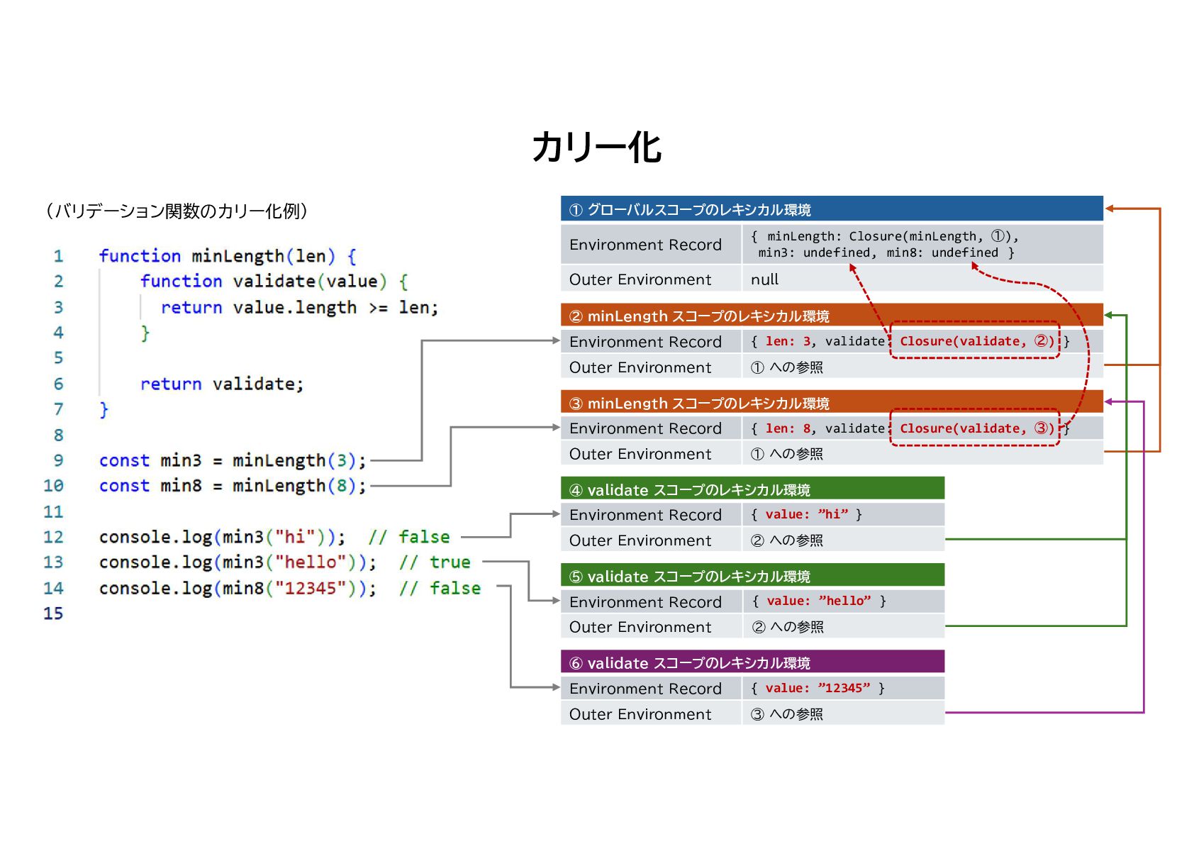 min8: undefined } Environment Record null Outer Environment ② minLength スコープのレキシカル環境 { len: 3, validate: Closure(validate, ②) } Environment Record ① への参照 Outer Environment ③ minLength スコープのレキシカル環境 { len: 8, validate: Closure(validate, ③) } Environment Record ① への参照 Outer Environment ④ validate スコープのレキシカル環境 { value: ”hi” } Environment Record ② への参照 Outer Environment ⑤ validate スコープのレキシカル環境 { value: ”hello” } Environment Record ② への参照 Outer Environment ⑥ validate スコープのレキシカル環境 { value: ”12345” } Environment Record ③ への参照 Outer Environment