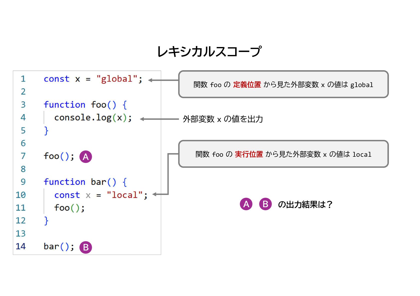の 実行位置 から見た外部変数 x の値は local 外部変数 x の値を出力 A B A B の出力結果は? レキシカルスコープ