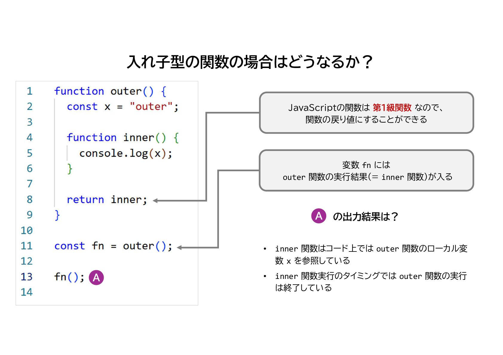 inner 関数)が入る A A の出力結果は? • inner 関数はコード上では outer 関数のローカル変 数 x を参照している • inner 関数実行のタイミングでは outer 関数の実行 は終了している