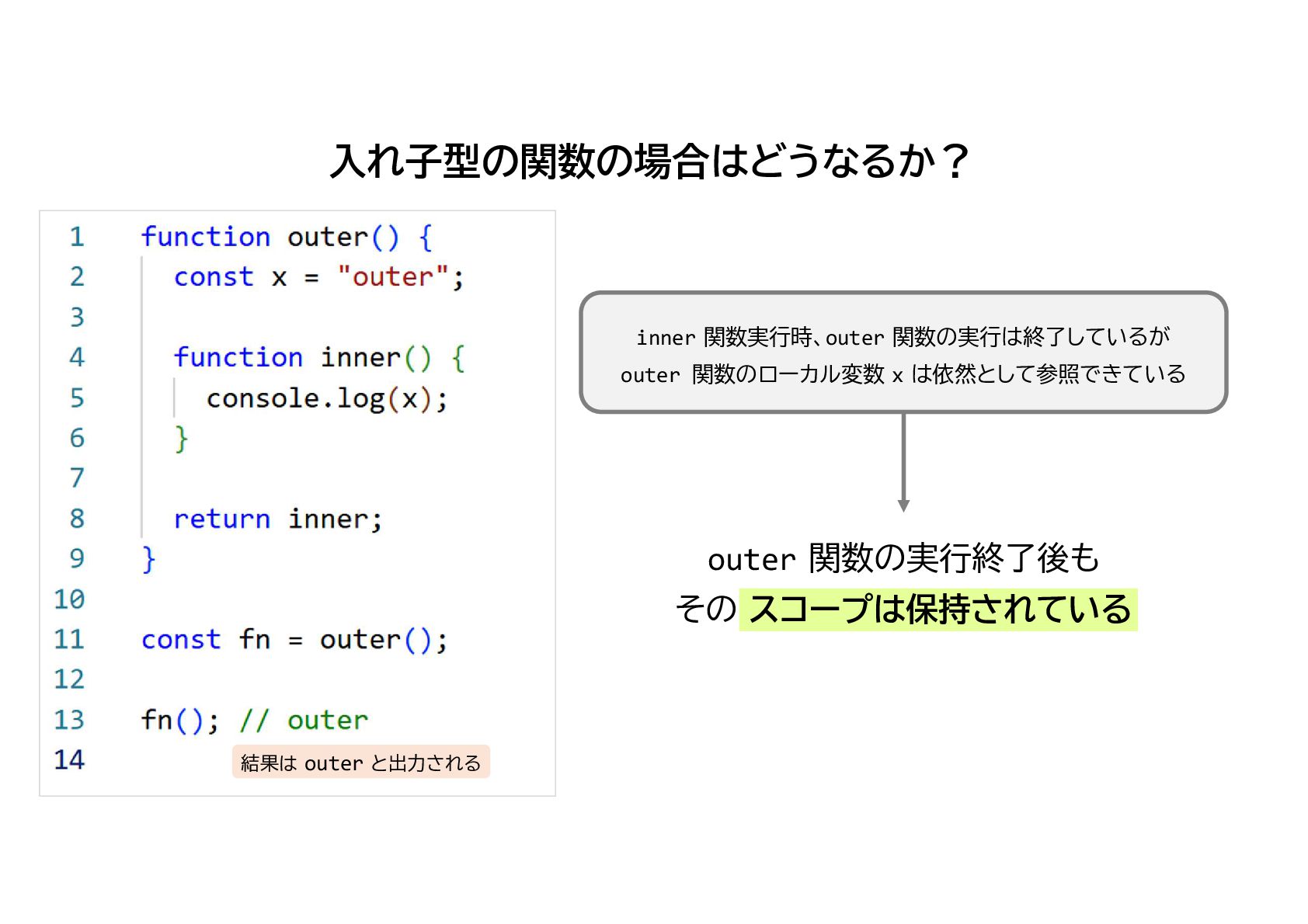 3. 結果は outer と出力される outer 関数の実行終了後も その スコープは保持されている inner 関数実行時、outer 関数の実行は終了しているが