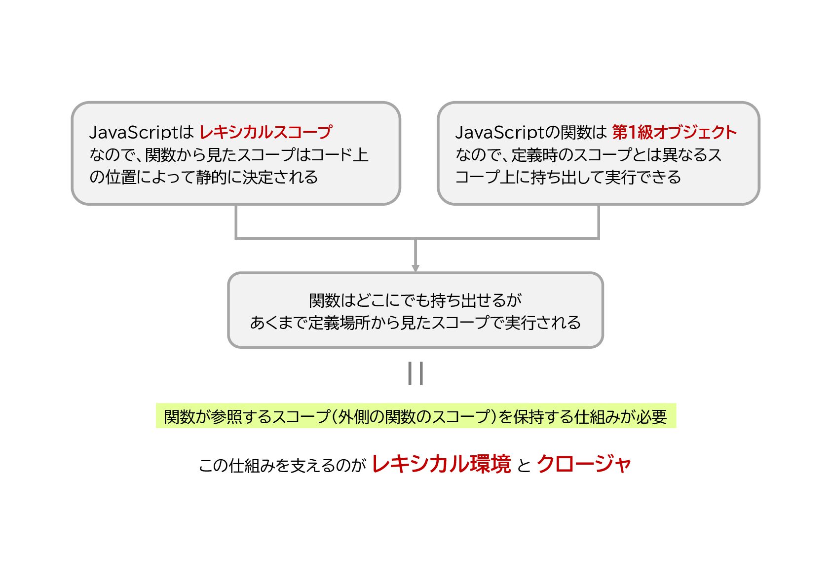 4. 関数が参照するスコープ(外側の関数のスコープ)を保持する仕組みが必要 この仕組みを支えるのが レキシカル環境 と クロージャ JavaScriptの関数は 第1級オブジェクト なので、定義時のスコープとは異なるス コープ上に持ち出して実行できる JavaScriptは
