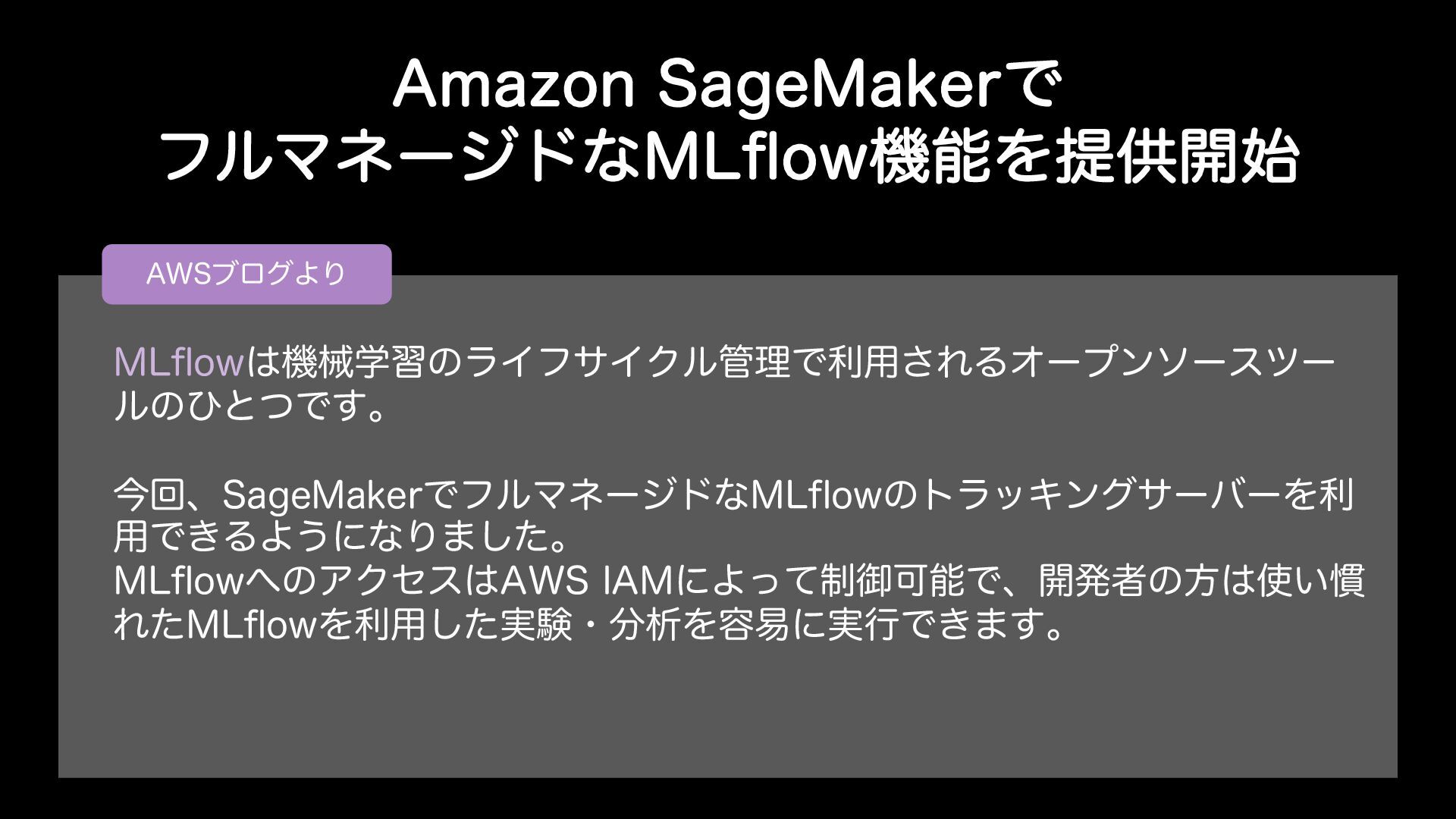 "NB[PO4BHF.BLFSͰ ϑϧϚωʔδυͳ.-qPXػೳΛఏڙ։࢝ "84ϒϩάΑΓ .-GMPXػցֶशͷϥΠϑαΠΫϧཧͰར༻͞ΕΔΦʔϓϯιʔεπʔ ϧͷͻͱͭͰ͢ɻ ࠓճɺ4BHF.BLFSͰϑϧϚωʔδυͳ.-GMPXͷτϥοΩϯάαʔόʔΛར ༻Ͱ͖ΔΑ͏ʹͳΓ·ͨ͠ɻ .-GMPXͷΞΫηε"84*".ʹΑ੍ͬͯޚՄೳͰɺ։ൃऀͷํ͍׳ Εͨ.-GMPXΛར༻࣮ͨ͠ݧɾੳΛ༰қʹ࣮ߦͰ͖·͢ɻ