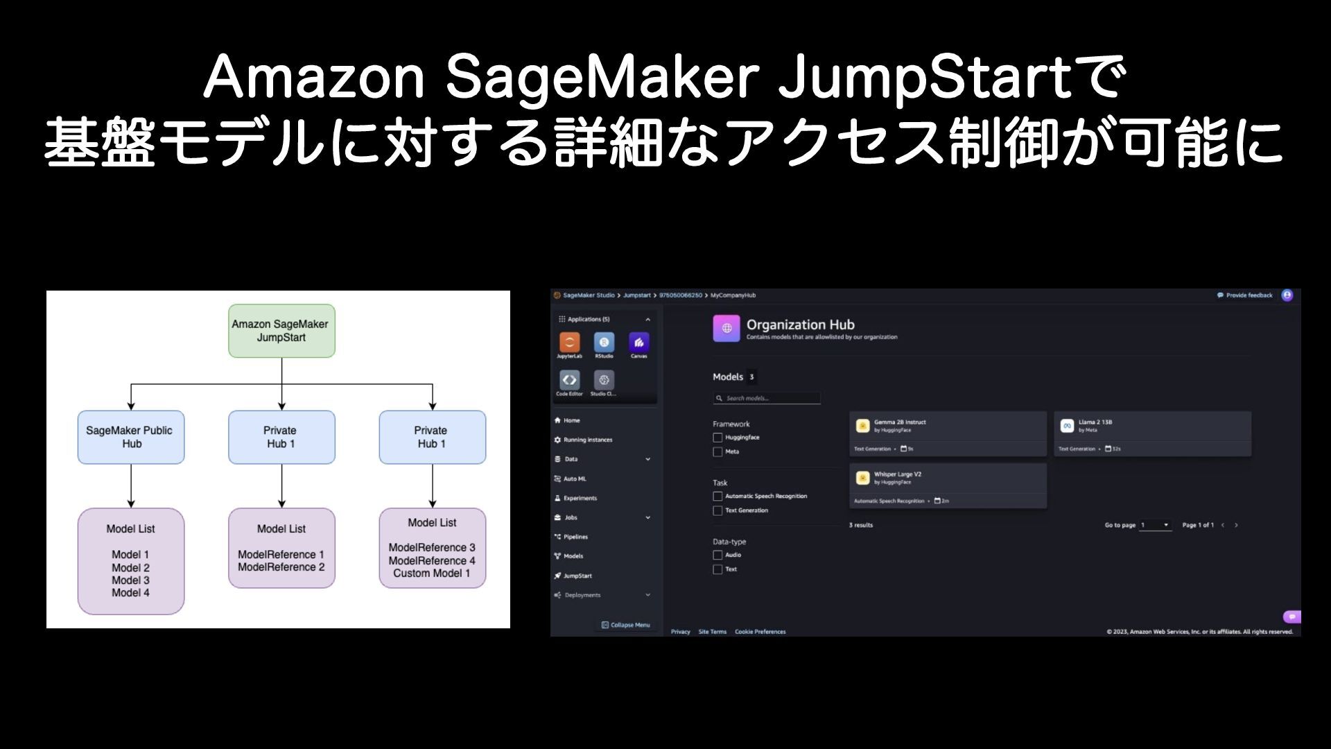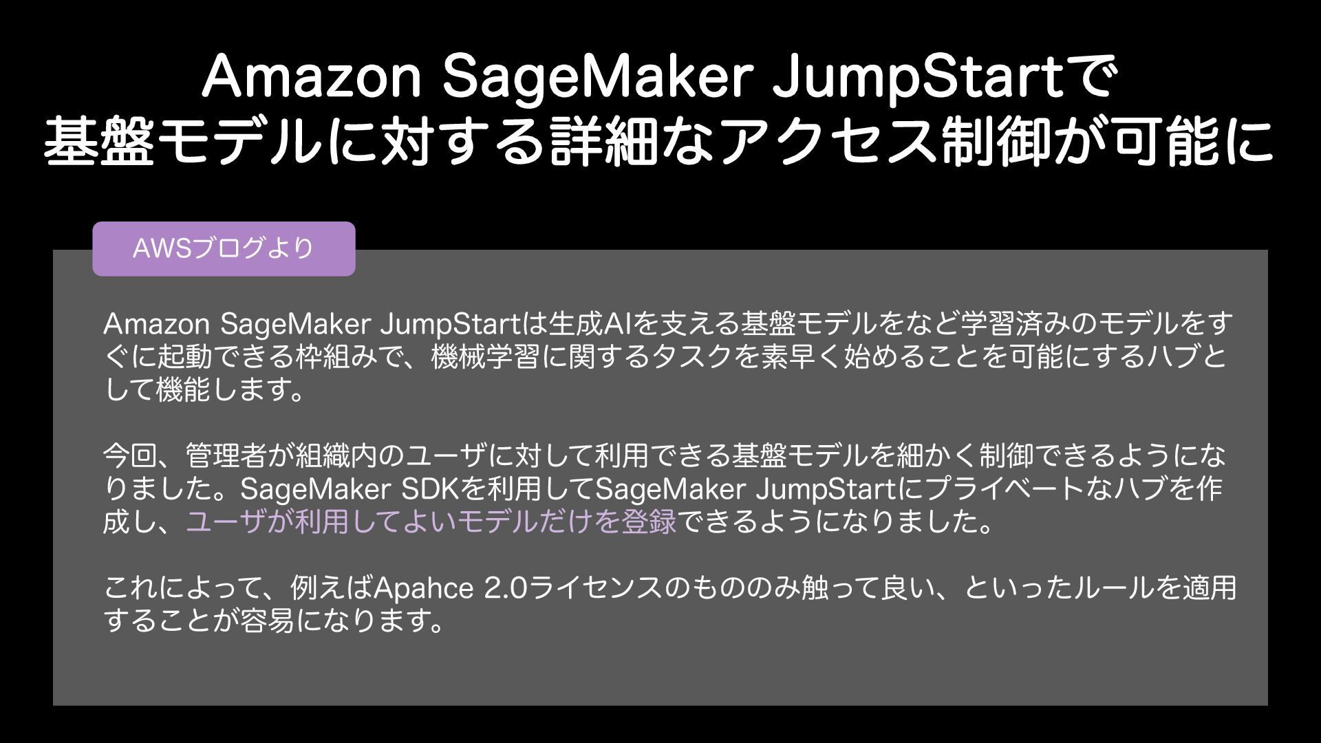 "NB[PO4BHF.BLFS +VNQ4UBSUͰ ج൫Ϟσϧʹର͢ΔৄࡉͳΞΫηε੍ޚ͕Մೳʹ "84ϒϩάΑΓ "NB[PO4BHF.BLFS +VNQ4UBSUੜ"*Λࢧ͑Δج൫ϞσϧΛͳͲֶशࡁΈͷϞσϧΛ͢ ͙ʹىಈͰ͖ΔΈͰɺػցֶशʹؔ͢ΔλεΫΛૉૣ࢝͘ΊΔ͜ͱΛՄೳʹ͢Δϋϒͱ ͯ͠ػೳ͠·͢ɻ ࠓճɺཧऀ͕৫ͷϢʔβʹରͯ͠ར༻Ͱ͖Δج൫ϞσϧΛࡉ੍͔͘ޚͰ͖ΔΑ͏ʹͳ Γ·ͨ͠ɻ4BHF.BLFS