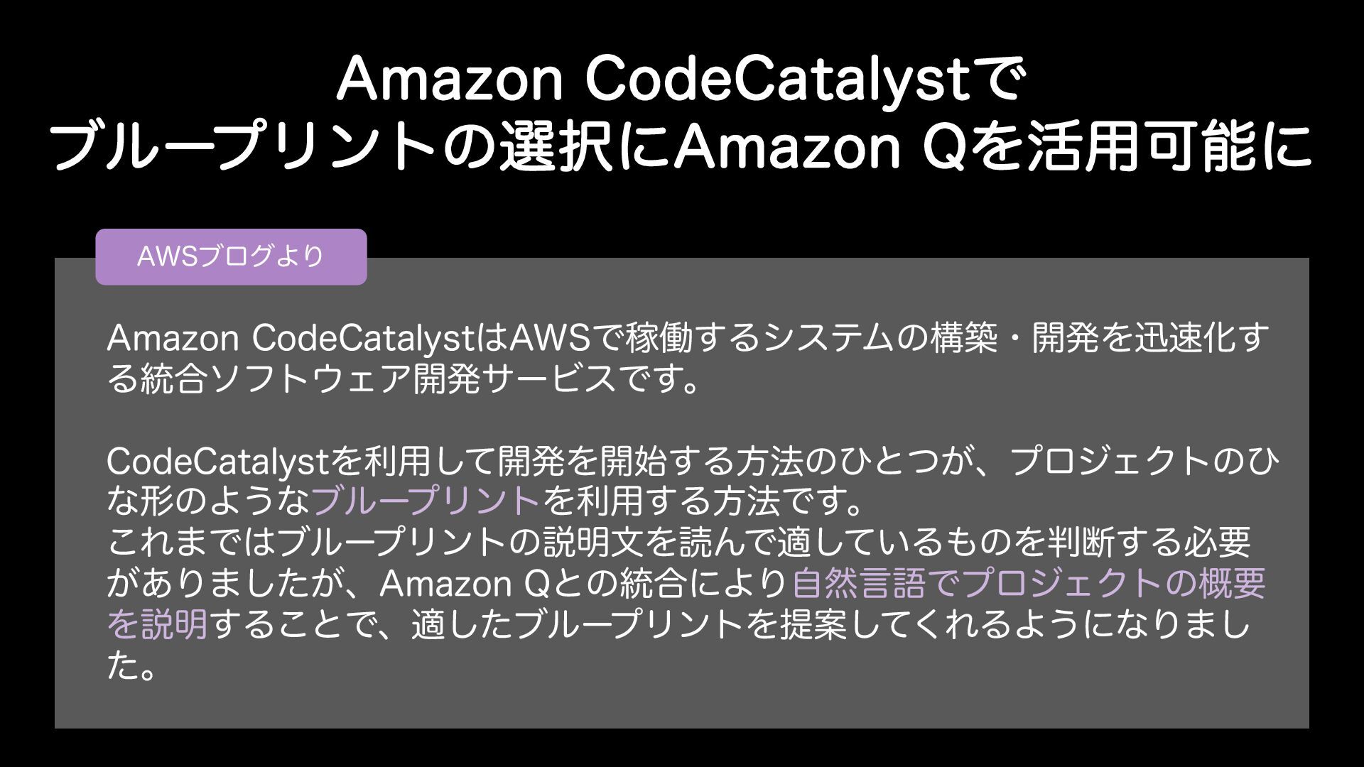 "NB[PO$PEF$BUBMZTUͰ ϒϧʔϓϦϯτͷબʹ"NB[PO2Λ׆༻Մೳʹ "84ϒϩάΑΓ "NB[PO$PEF$BUBMZTU"84ͰՔಇ͢ΔγεςϜͷߏஙɾ։ൃΛਝԽ͢ Δ౷߹ιϑτΣΞ։ൃαʔϏεͰ͢ɻ $PEF$BUBMZTUΛར༻ͯ͠։ൃΛ։࢝͢Δํ๏ͷͻͱ͕ͭɺϓϩδΣΫτͷͻ ͳܗͷΑ͏ͳϒϧʔϓϦϯτΛར༻͢Δํ๏Ͱ͢ɻ ͜Ε·ͰϒϧʔϓϦϯτͷઆ໌จΛಡΜͰద͍ͯ͠ΔͷΛஅ͢Δඞཁ ͕͋Γ·͕ͨ͠ɺ"NB[PO2ͱͷ౷߹ʹΑΓࣗવݴޠͰϓϩδΣΫτͷ֓ཁ Λઆ໌͢Δ͜ͱͰɺదͨ͠ϒϧʔϓϦϯτΛఏҊͯ͘͠ΕΔΑ͏ʹͳΓ·͠
