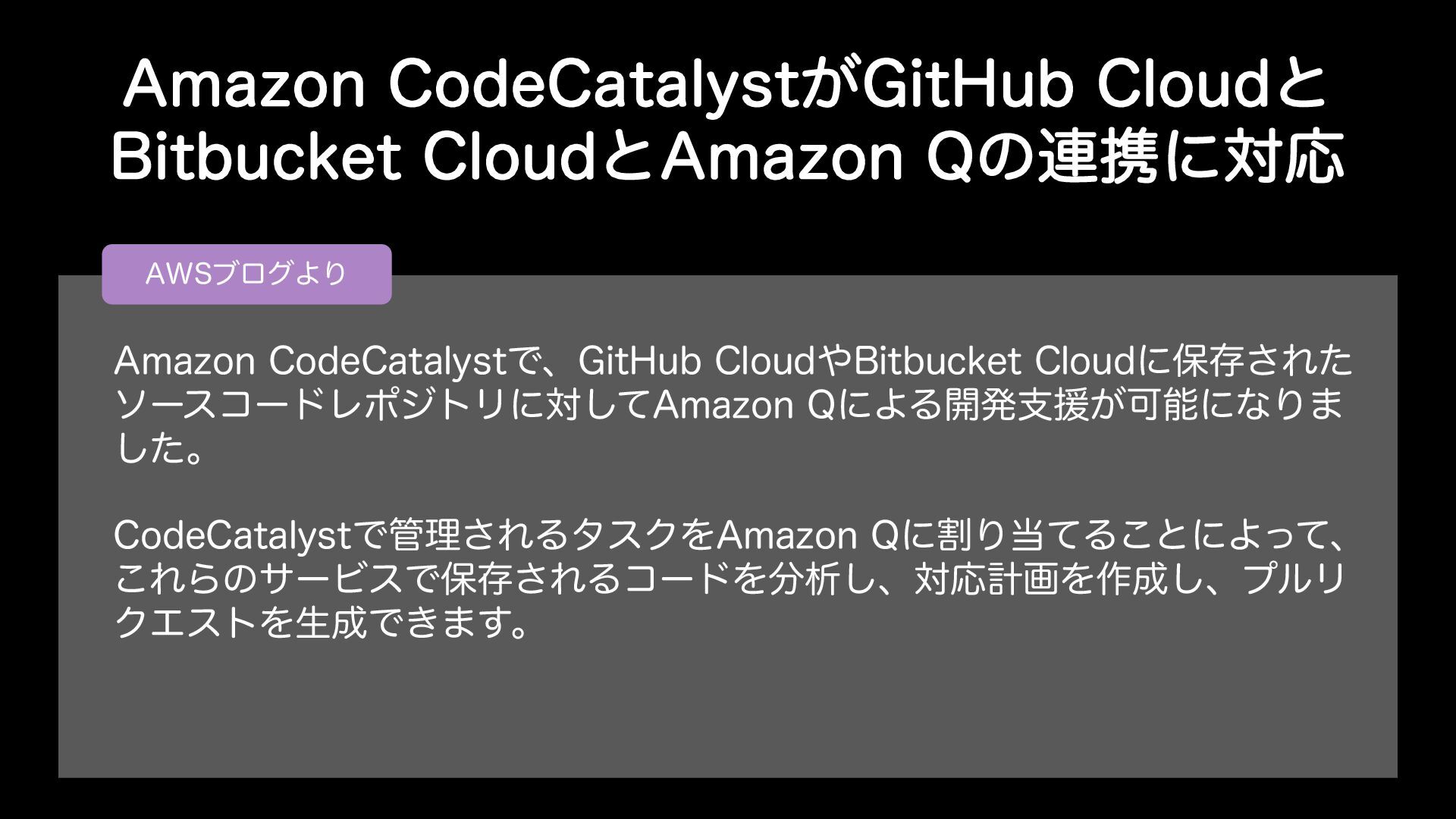 "NB[PO$PEF$BUBMZTU͕(JU)VC$MPVEͱ #JUCVDLFU$MPVEͱ"NB[PO2ͷ࿈ܞʹରԠ "84ϒϩάΑΓ "NB[PO$PEF$BUBMZTUͰɺ(JU)VC$MPVE#JUCVDLFU$MPVEʹอଘ͞Εͨ ιʔείʔυϨϙδτϦʹରͯ͠"NB[PO2ʹΑΔ։ൃࢧԉ͕ՄೳʹͳΓ· ͨ͠ɻ $PEF$BUBMZTUͰཧ͞ΕΔλεΫΛ"NB[PO2ʹׂΓͯΔ͜ͱʹΑͬͯɺ ͜ΕΒͷαʔϏεͰอଘ͞ΕΔίʔυΛੳ͠ɺରԠܭըΛ࡞͠ɺϓϧϦ ΫΤετΛੜͰ͖·͢ɻ
