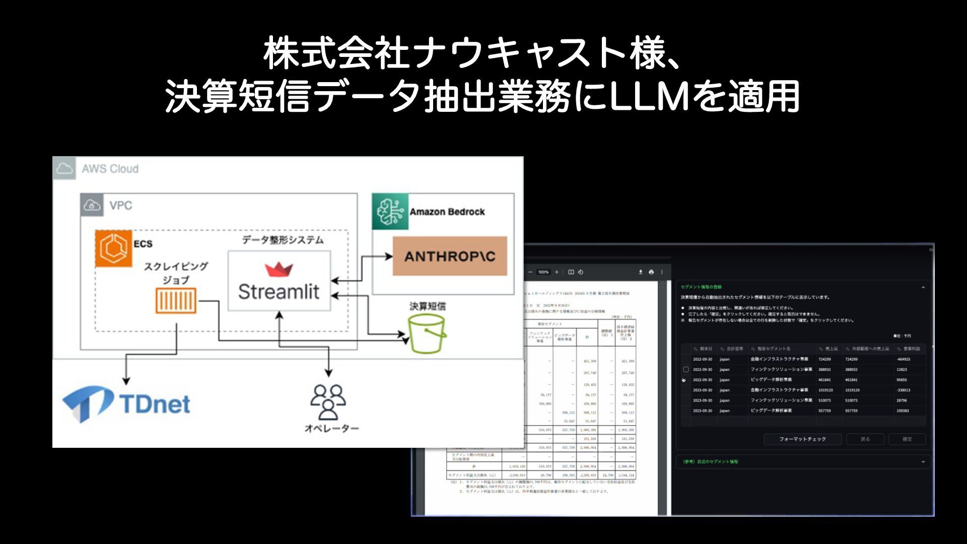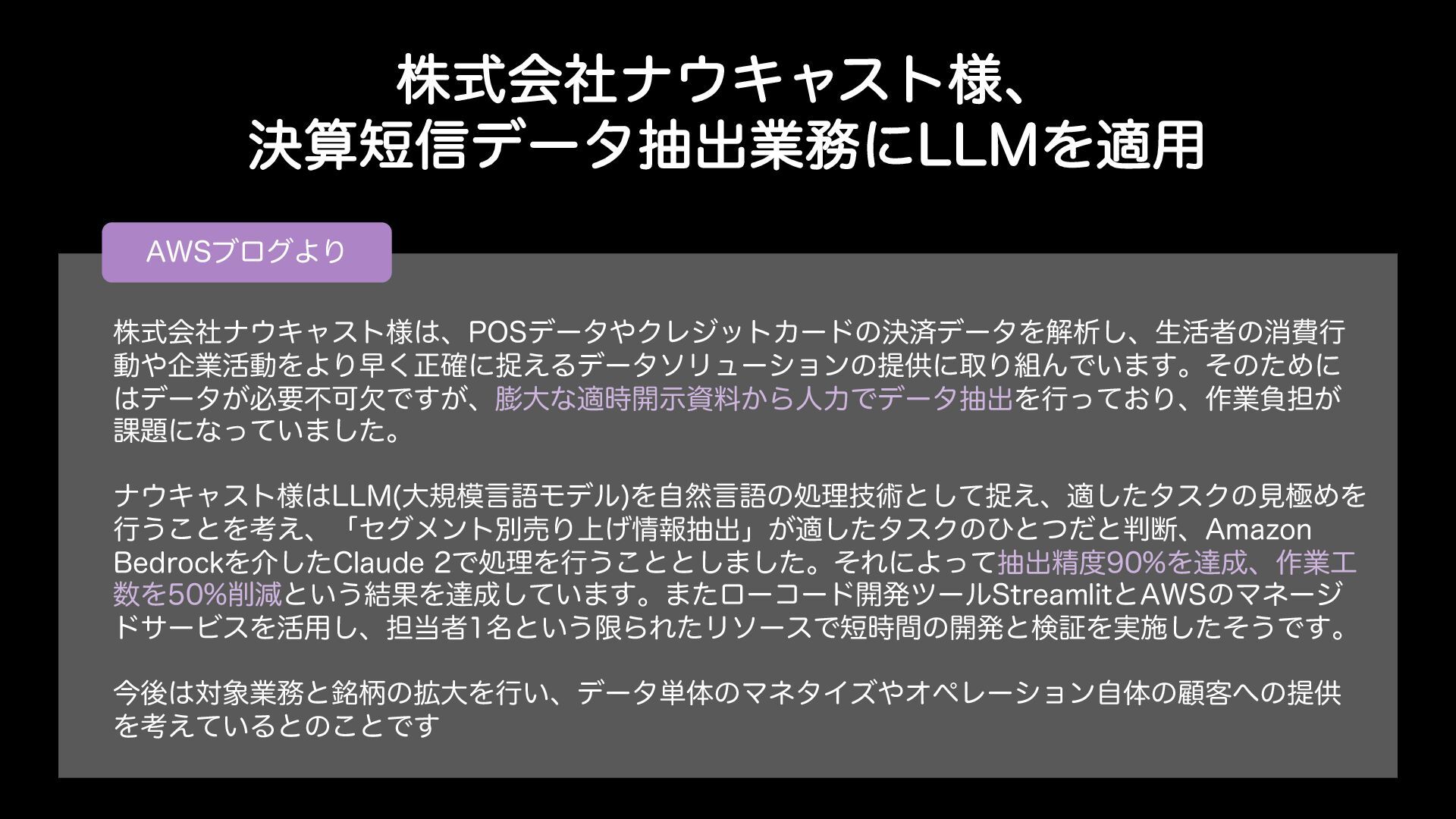 ߦ͏͜ͱΛߟ͑ɺʮηάϝϯτผചΓ্͛ใநग़ʯ͕దͨ͠λεΫͷͻͱͭͩͱஅɺ"NB[PO #FESPDLΛհͨ͠$MBVEFͰॲཧΛߦ͏͜ͱͱ͠·ͨ͠ɻͦΕʹΑͬͯநग़ਫ਼Λୡɺ࡞ۀ Λݮͱ͍͏݁ՌΛୡ͍ͯ͠·͢ɻ·ͨϩʔίʔυ։ൃπʔϧ4USFBNMJUͱ"84ͷϚωʔδ υαʔϏεΛ׆༻͠ɺ୲ऀ໊ͱ͍͏ݶΒΕͨϦιʔεͰ࣌ؒͷ։ൃͱݕূΛ࣮ࢪͨͦ͠͏Ͱ͢ɻ ࠓޙରۀͱฑͷ֦େΛߦ͍ɺσʔλ୯ମͷϚωλΠζΦϖϨʔγϣϯࣗମͷސ٬ͷఏڙ Λߟ͍͑ͯΔͱͷ͜ͱͰ͢