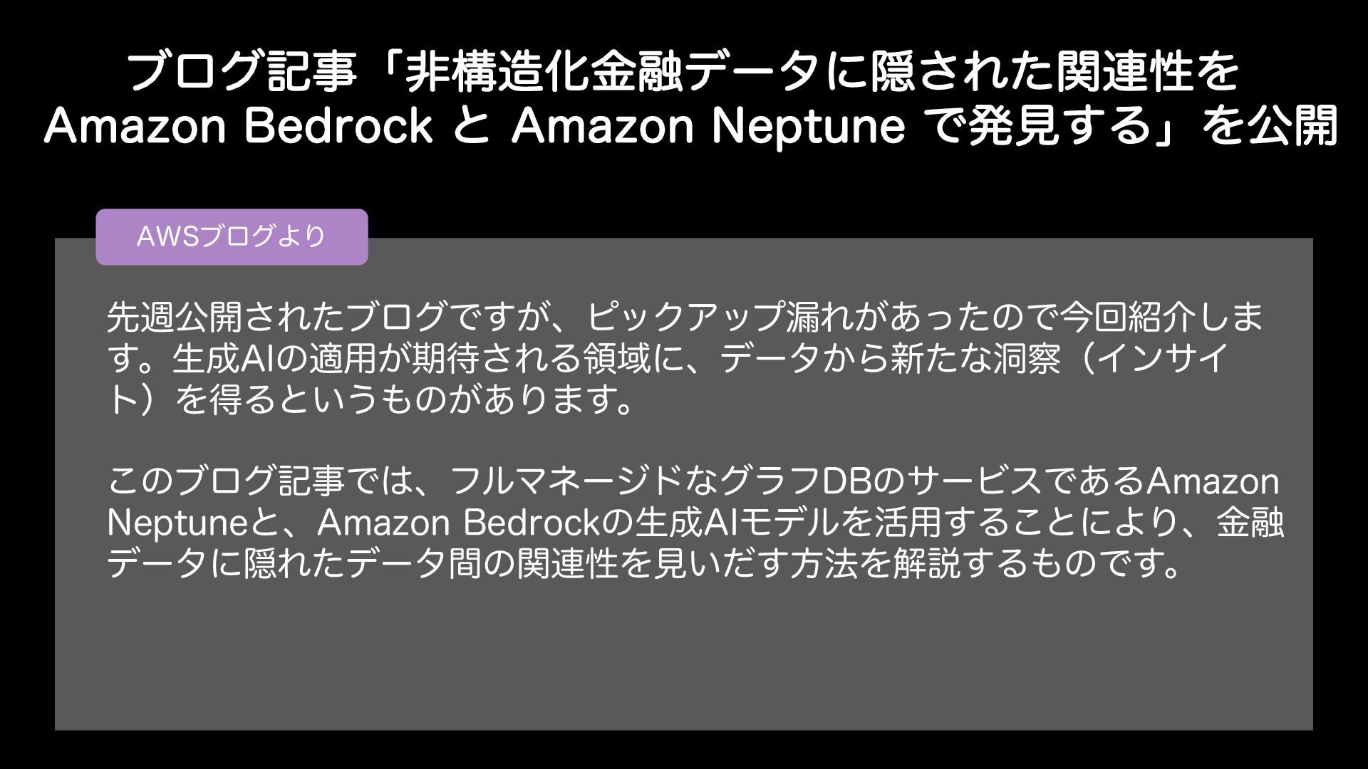 ϒϩάهࣄʮඇߏԽۚ༥σʔλʹӅ͞Εͨؔ࿈ੑΛ "NB[PO#FESPDLͱ"NB[PO/FQUVOFͰൃݟ͢ΔʯΛެ։ "84ϒϩάΑΓ ઌिެ։͞ΕͨϒϩάͰ͕͢ɺϐοΫΞοϓ࿙Ε͕͋ͬͨͷͰࠓճհ͠· ͢ɻੜ"*ͷద༻͕ظ͞ΕΔྖҬʹɺσʔλ͔Β৽ͨͳಎʢΠϯαΠ τʣΛಘΔͱ͍͏ͷ͕͋Γ·͢ɻ ͜ͷϒϩάهࣄͰɺϑϧϚωʔδυͳάϥϑ%#ͷαʔϏεͰ͋Δ"NB[PO /FQUVOFͱɺ"NB[PO#FESPDLͷੜ"*ϞσϧΛ׆༻͢Δ͜ͱʹΑΓɺۚ༥ σʔλʹӅΕͨσʔλؒͷؔ࿈ੑΛݟ͍ͩ͢ํ๏Λղઆ͢ΔͷͰ͢ɻ