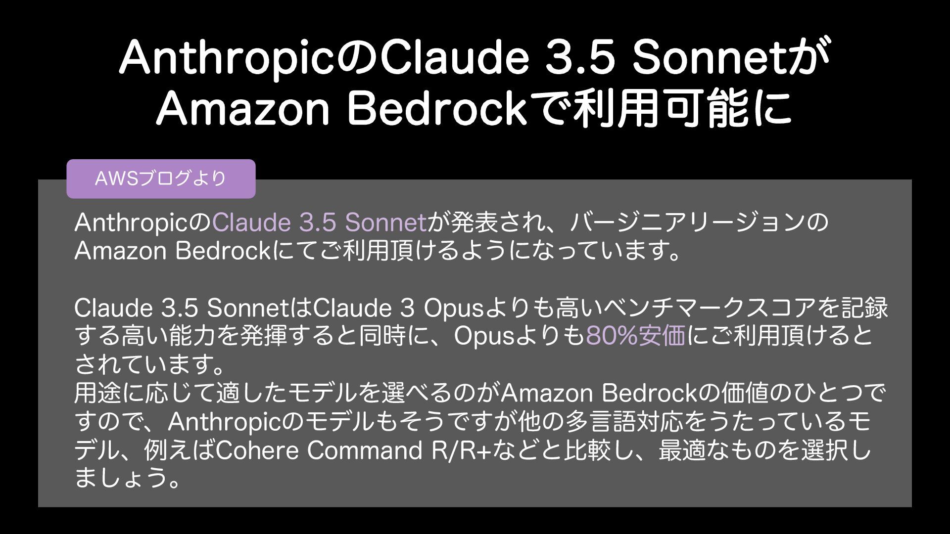 "OUISPQJDͷ$MBVEF4POOFU͕ "NB[PO#FESPDLͰར༻Մೳʹ "84ϒϩάΑΓ "OUISPQJDͷ$MBVEF4POOFU͕ൃද͞ΕɺόʔδχΞϦʔδϣϯͷ "NB[PO#FESPDLʹͯ͝ར༻͚ΔΑ͏ʹͳ͍ͬͯ·͢ɻ $MBVEF4POOFU$MBVEF0QVTΑΓߴ͍ϕϯνϚʔΫείΞΛه ͢Δߴ͍ೳྗΛൃش͢Δͱಉ࣌ʹɺ0QVTΑΓ҆Ձʹ͝ར༻͚Δͱ ͞Ε͍ͯ·͢ɻ ༻్ʹԠͯ͡దͨ͠ϞσϧΛબΔͷ͕"NB[PO#FESPDLͷՁͷͻͱͭͰ ͢ͷͰɺ"OUISPQJDͷϞσϧͦ͏Ͱ͕͢ଞͷଟݴޠରԠΛ͏͍ͨͬͯΔϞ