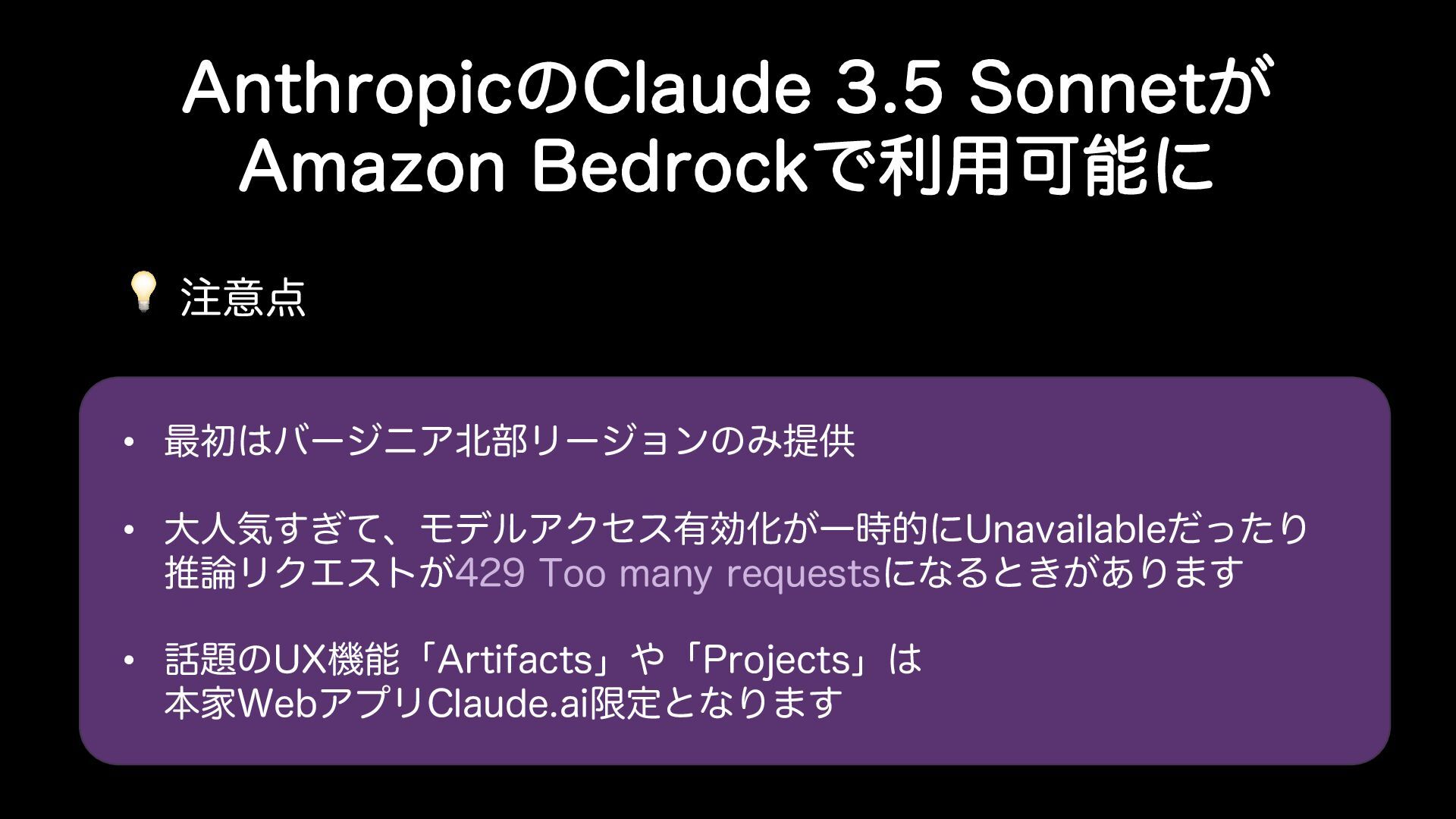 "OUISPQJDͷ$MBVEF4POOFU͕ "NB[PO#FESPDLͰར༻Մೳʹ 💡 ҙ • ࠷ॳόʔδχΞ෦ϦʔδϣϯͷΈఏڙ • େਓؾ͗ͯ͢ɺϞσϧΞΫηε༗ޮԽ͕Ұ࣌తʹ6OBWBJMBCMFͩͬͨΓ ਪϦΫΤετ͕5PPNBOZSFRVFTUTʹͳΔͱ͖͕͋Γ·͢ •