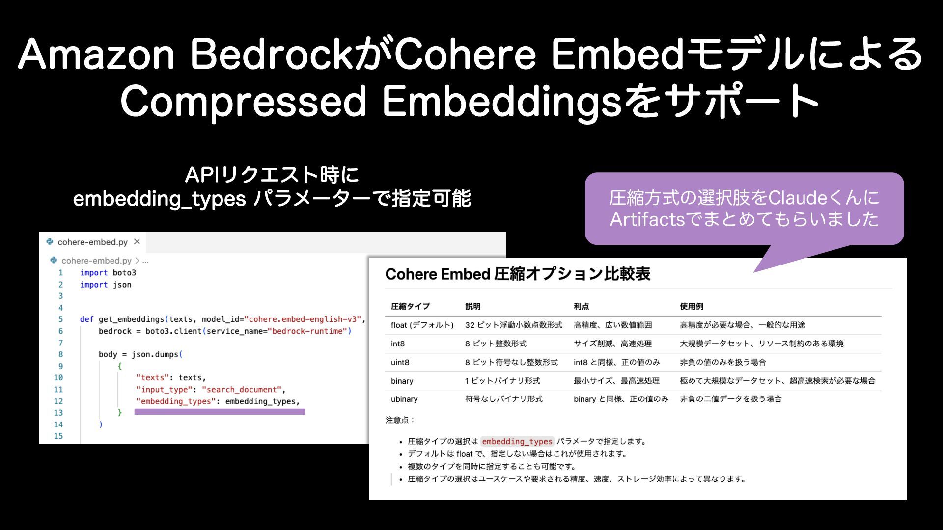"NB[PO#FESPDL͕$PIFSF&NCFEϞσϧʹΑΔ $PNQSFTTFE&NCFEEJOHTΛαϙʔτ "1*ϦΫΤετ࣌ʹ FNCFEEJOH@UZQFT ύϥϝʔλʔͰࢦఆՄೳ ѹॖํࣜͷબࢶΛ$MBVEF͘Μʹ "SUJGBDUTͰ·ͱΊͯΒ͍·ͨ͠