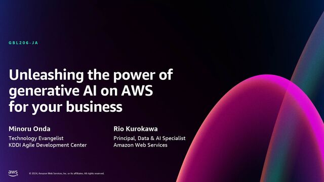 rights reserved. © 2024, Amazon Web Services, Inc. or its affiliates. All rights reserved. Unleashing the power of generative AI on AWS for your business Minoru Onda G B L 2 0 6 - J A Technology Evangelist KDDI Agile Development Center Rio Kurokawa Principal, Data & AI Specialist Amazon Web Services