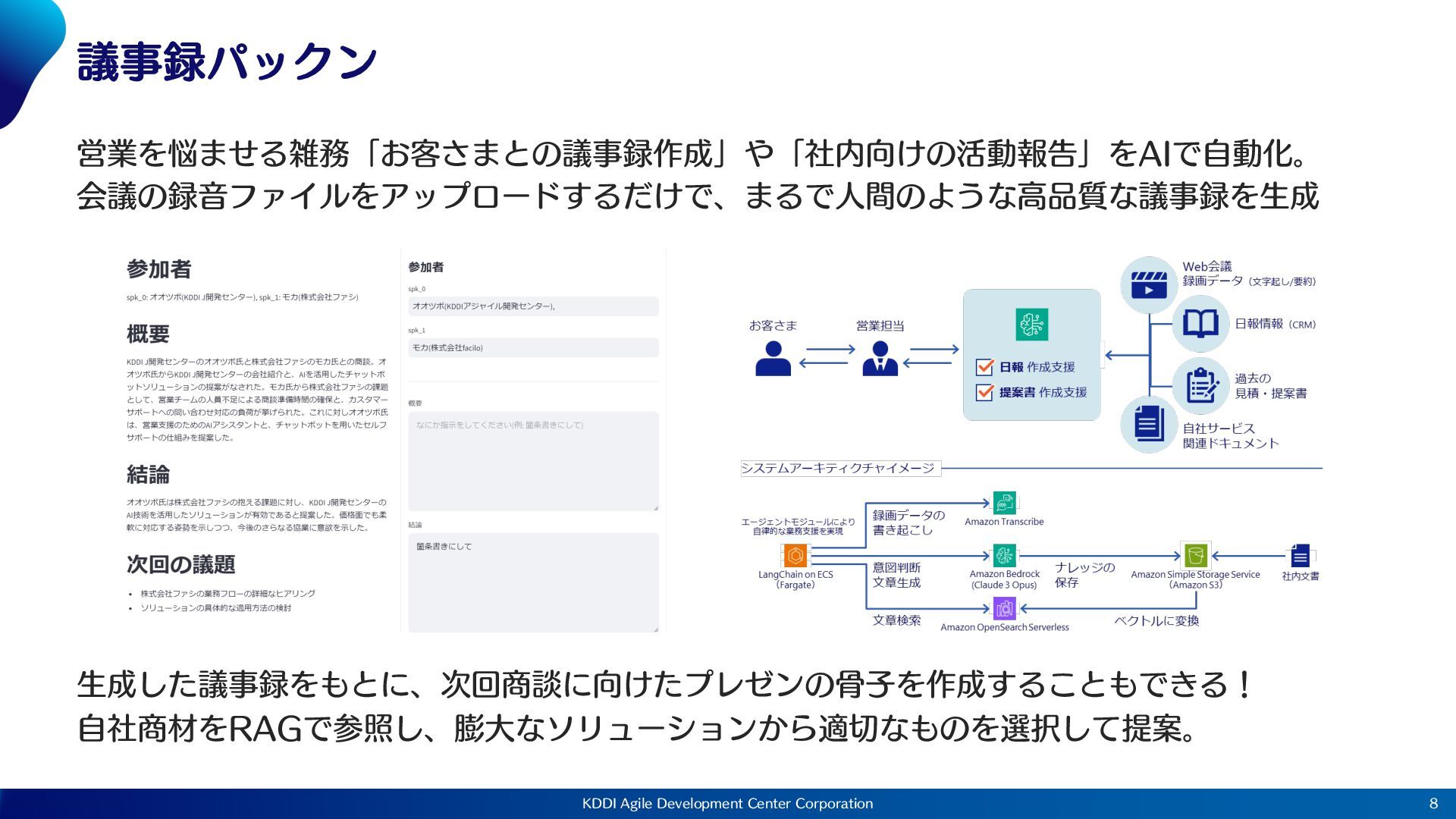 ,%%*"HJMF%FWFMPQNFOU$FOUFS$PSQPSBUJPO ٞࣄύοΫϯ ӦۀΛ·ͤΔࡶʮ͓٬͞·ͱͷٞࣄ࡞ʯʮ͚ࣾͷ׆ಈใࠂʯΛ"*ͰࣗಈԽɻ ձٞͷԻϑΝΠϧΛΞοϓϩʔυ͢Δ͚ͩͰɺ·ΔͰਓؒͷΑ͏ͳߴ࣭ͳٞࣄΛੜ ੜͨٞ͠ࣄΛͱʹɺ࣍ճஊʹ͚ͨϓϨθϯͷࠎࢠΛ࡞͢Δ͜ͱͰ͖Δʂ ࣗࣾࡐΛ3"(Ͱࢀর͠ɺେͳιϦϡʔγϣϯ͔ΒదͳͷΛબͯ͠ఏҊɻ