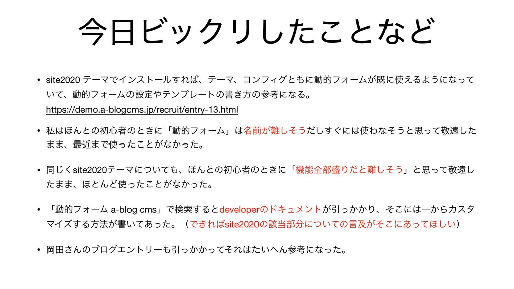 ಉ͘͡site2020ςʔϚʹ͍ͭͯɺ΄Μͱͷॳ৺ऀͷͱ͖ʹʮػೳશ෦Γͩͱͦ͠͏ʯͱࢥͬͯܟԕ͠ ͨ··ɺ΄ͱΜͲͬͨ͜ͱ͕ͳ͔ͬͨɻ • ʮಈతϑΥʔϜ a-blog cmsʯͰݕࡧ͢ΔͱdeveloperͷυΩϡϝϯτ͕Ҿ͔͔ͬΓɺͦ͜ʹҰ͔ΒΧελ ϚΠζ͢Δํ๏͕ॻ͍ͯ͋ͬͨɻʢͰ͖Εsite2020ͷ֘෦ʹ͍ͭͯͷݴٴ͕ͦ͜ʹ͋ͬͯ΄͍͠ʣ • Ԭా͞ΜͷϒϩάΤϯτϦʔҾ͔͔ͬͬͯͦΕ͍ͨΜࢀߟʹͳͬͨɻ
