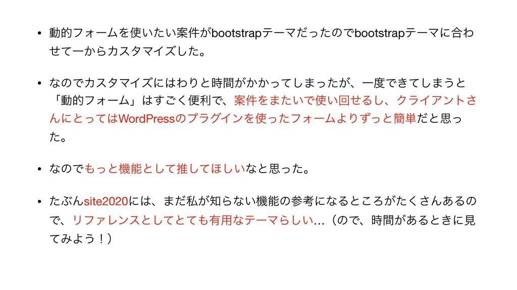 • ಈతϑΥʔϜΛ͍͍ͨҊ͕݅bootstrapςʔϚͩͬͨͷͰbootstrapςʔϚʹ߹Θ ͤͯҰ͔ΒΧελϚΠζͨ͠ɻ • ͳͷͰΧελϚΠζʹΘΓͱ͕͔͔࣌ؒͬͯ͠·͕ͬͨɺҰͰ͖ͯ͠·͏ͱ ʮಈతϑΥʔϜʯ͘͢͝ศརͰɺҊ݅Λ·͍ͨͰ͍ճͤΔ͠ɺΫϥΠΞϯτ͞ ΜʹͱͬͯWordPressͷϓϥάΠϯΛͬͨϑΥʔϜΑΓͣͬͱ؆୯ͩͱࢥͬ ͨɻ • ͳͷͰͬͱػೳͱͯ͠ਪͯ͠΄͍͠ͳͱࢥͬͨɻ