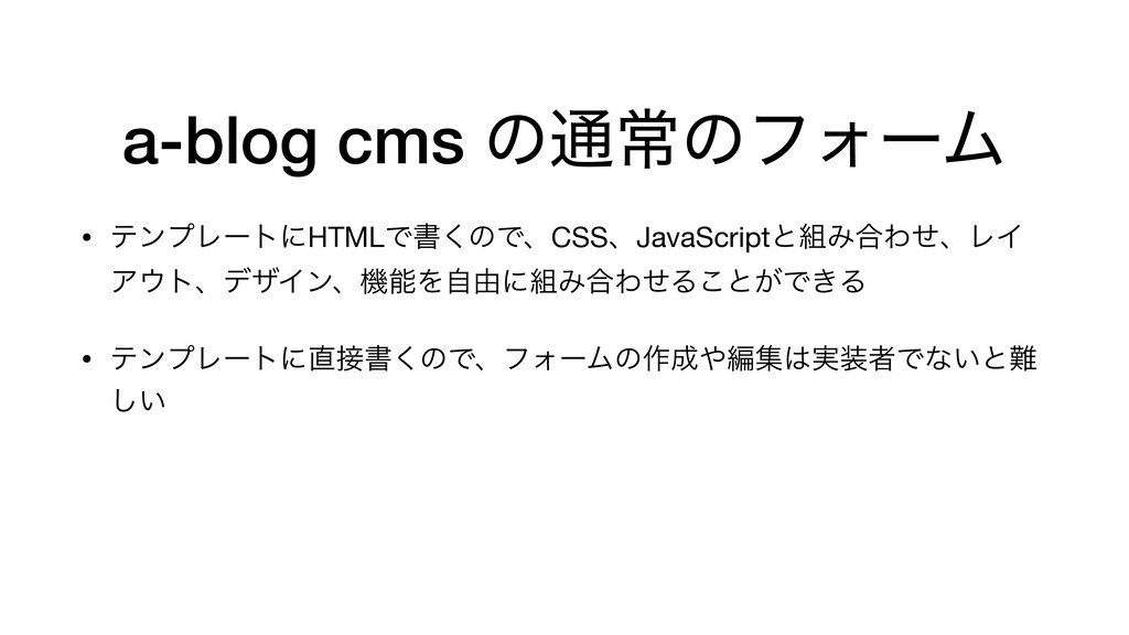 a-blog cms ͷ௨ৗͷϑΥʔϜ • ςϯϓϨʔτʹHTMLͰॻ͘ͷͰɺCSSɺJavaScriptͱΈ߹ΘͤɺϨΠ ΞτɺσβΠϯɺػೳΛࣗ༝ʹΈ߹ΘͤΔ͜ͱ͕Ͱ͖Δ • ςϯϓϨʔτʹॻ͘ͷͰɺϑΥʔϜͷ࡞ฤू࣮ऀͰͳ͍ͱ ͍͠