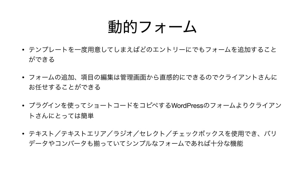 ಈతϑΥʔϜ • ςϯϓϨʔτΛҰ༻ҙͯ͠͠·͑ͲͷΤϯτϦʔʹͰϑΥʔϜΛՃ͢Δ͜ͱ ͕Ͱ͖Δ • ϑΥʔϜͷՃɺ߲ͷฤूཧը໘͔ΒײతʹͰ͖ΔͷͰΫϥΠΞϯτ͞Μʹ ͓ͤ͢Δ͜ͱ͕Ͱ͖Δ • ϓϥάΠϯΛͬͯγϣʔτίʔυΛίϐϖ͢ΔWordPressͷϑΥʔϜΑΓΫϥΠΞϯ τ͞Μʹͱͬͯ؆୯