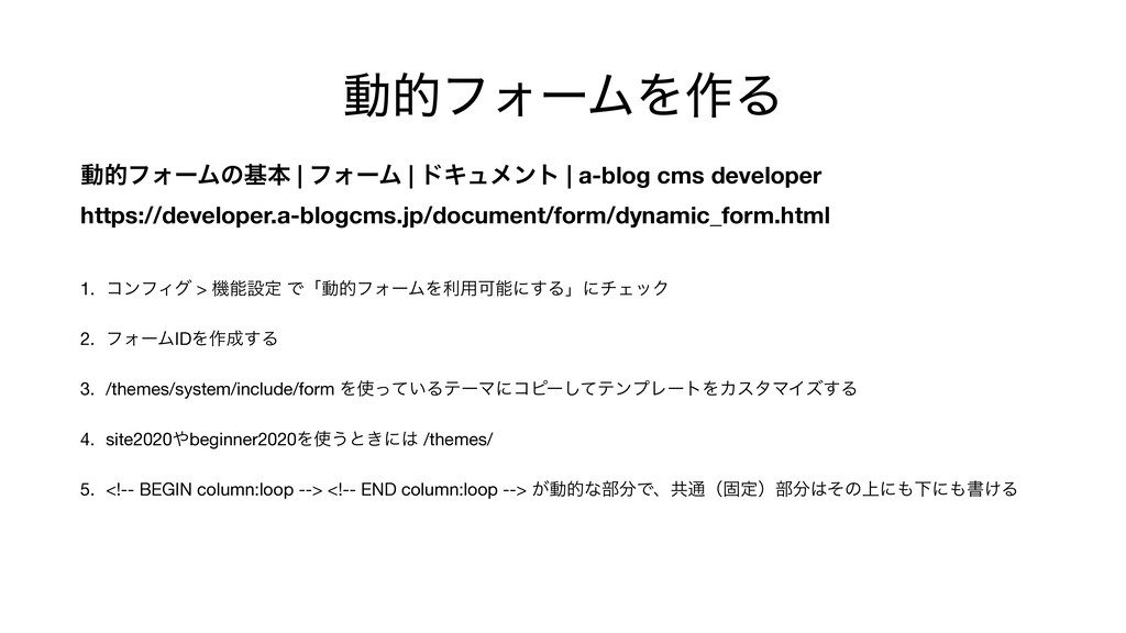 Λ͍ͬͯΔςʔϚʹίϐʔͯ͠ςϯϓϨʔτΛΧελϚΠζ͢Δ 4. site2020beginner2020Λ͏ͱ͖ʹ /themes/ 5. <!-- BEGIN column:loop --> <!-- END column:loop --> ͕ಈతͳ෦Ͱɺڞ௨ʢݻఆʣ෦ͦͷ্ʹԼʹॻ͚Δ ಈతϑΥʔϜͷجຊ | ϑΥʔϜ | υΩϡϝϯτ | a-blog cms developer https://developer.a-blogcms.jp/document/form/dynamic_form.html