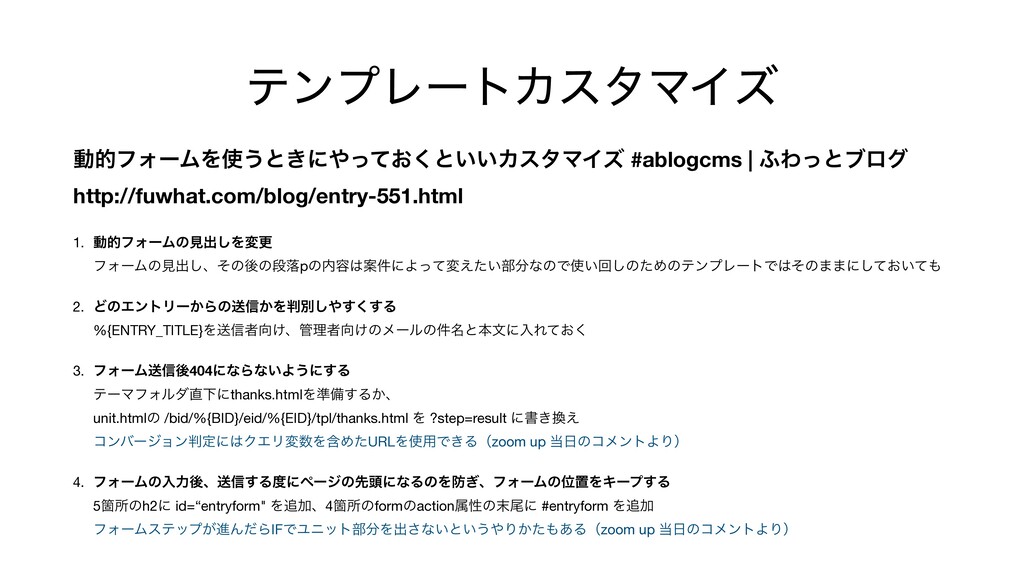 unit.htmlͷ /bid/%{BID}/eid/%{EID}/tpl/thanks.html Λ ?step=result ʹॻ͖͑ ίϯόʔδϣϯఆʹΫΤϦมΛؚΊͨURLΛ༻Ͱ͖Δʢzoom up ͷίϝϯτΑΓʣ 4. ϑΥʔϜͷೖྗޙɺૹ৴͢Δʹϖʔδͷઌ಄ʹͳΔͷΛ͗ɺϑΥʔϜͷҐஔΛΩʔϓ͢Δ 5Օॴͷh2ʹ id=“entryform" ΛՃɺ4Օॴͷformͷactionଐੑͷඌʹ #entryform ΛՃ ϑΥʔϜεςοϓ͕ਐΜͩΒIFͰϢχοτ෦Λग़͞ͳ͍ͱ͍͏Γ͔ͨ͋Δʢzoom up ͷίϝϯτΑΓʣ ಈతϑΥʔϜΛ͏ͱ͖ʹ͓ͬͯ͘ͱ͍͍ΧελϚΠζ #ablogcms | ;Θͬͱϒϩά http://fuwhat.com/blog/entry-551.html