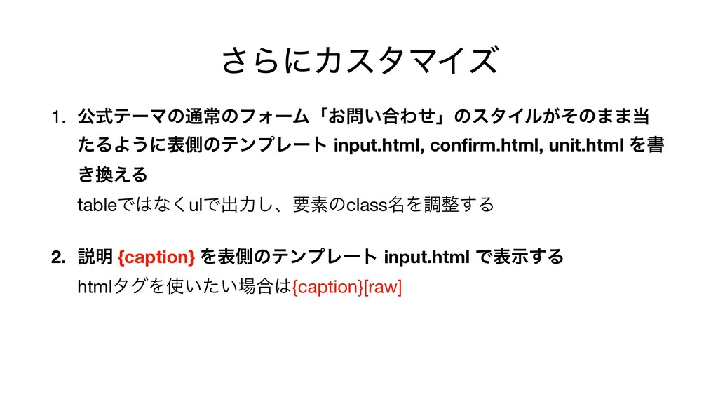 ͞ΒʹΧελϚΠζ 1. ެࣜςʔϚͷ௨ৗͷϑΥʔϜʮ͓͍߹ΘͤʯͷελΠϧ͕ͦͷ·· ͨΔΑ͏ʹදଆͷςϯϓϨʔτ input.html, con fi rm.html, unit.html Λॻ