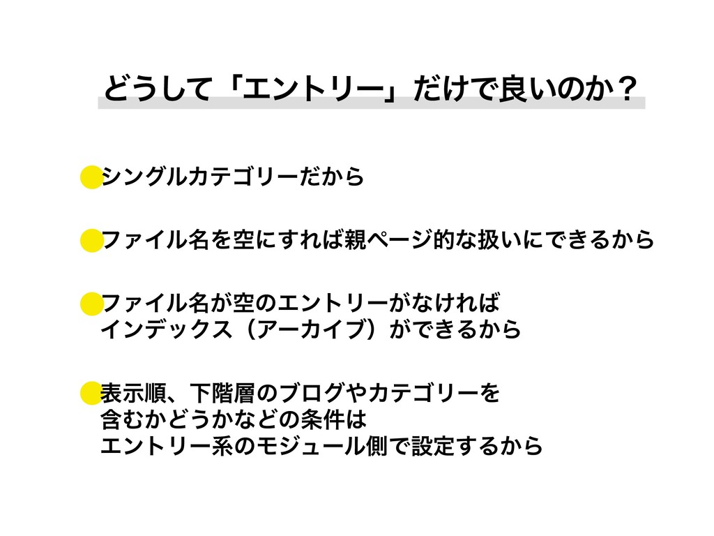 Ͳ͏ͯ͠ʮΤϯτϦʔʯ͚ͩͰྑ͍ͷ͔ʁ γϯάϧΧςΰϦʔ͔ͩΒ ϑΝΠϧ໊Λۭʹ͢Εϖʔδతͳѻ͍ʹͰ͖Δ͔Β ϑΝΠϧ໊͕ۭͷΤϯτϦʔ͕ͳ͚Ε ΠϯσοΫεʢΞʔΧΠϒʣ͕Ͱ͖Δ͔Β දࣔॱɺԼ֊ͷϒϩάΧςΰϦʔΛ ؚΉ͔Ͳ͏͔ͳͲͷ݅ ΤϯτϦʔܥͷϞδϡʔϧଆͰઃఆ͢Δ͔Β