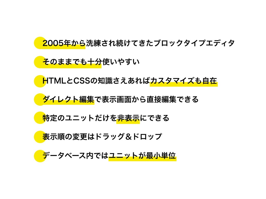 ͔Βચ࿅͞Εଓ͚͖ͯͨϒϩοΫλΠϓΤσΟλ ͦͷ··Ͱे͍͍͢ )5.-ͱ$44ͷࣝ͑͋͞ΕΧελϚΠζࣗࡏ μΠϨΫτฤूͰදࣔը໘͔ΒฤूͰ͖Δ ಛఆͷϢχοτ͚ͩΛඇදࣔʹͰ͖Δ දࣔॱͷมߋυϥοάˍυϩοϓ σʔλϕʔεͰϢχοτ͕࠷খ୯Ґ