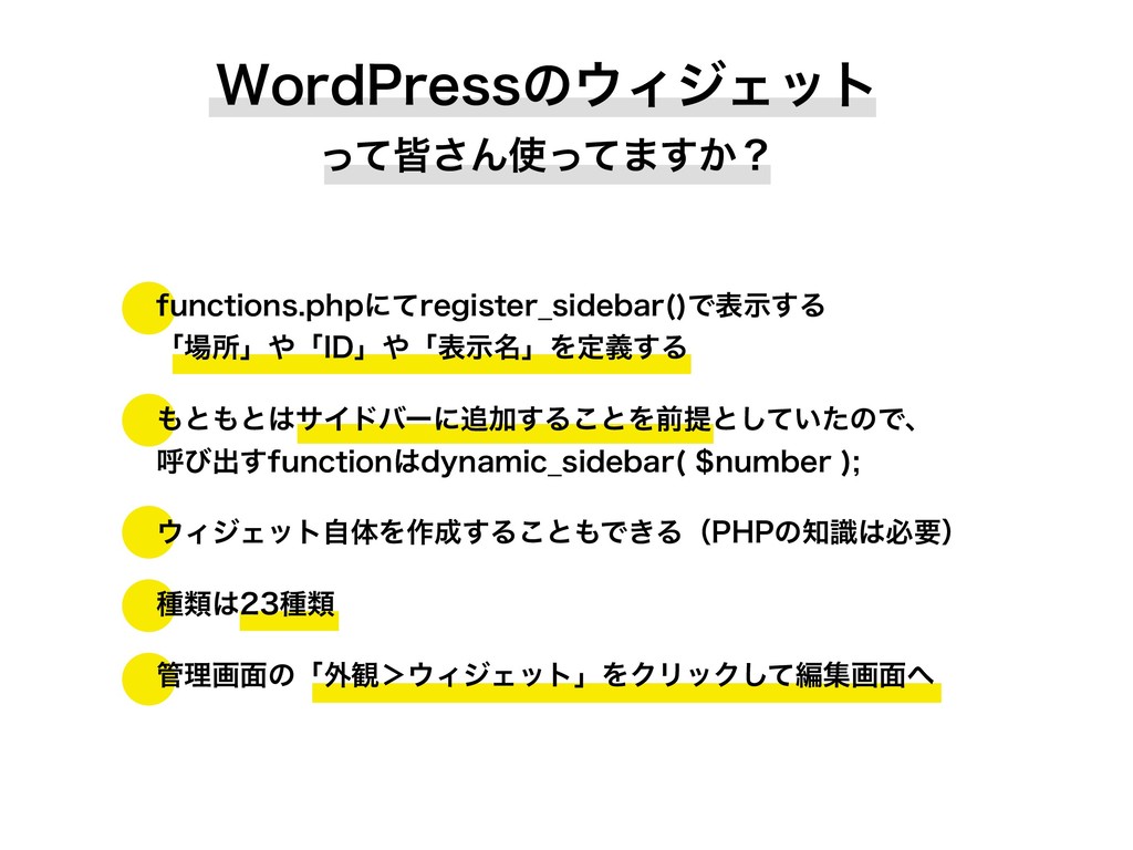8PSE1SFTTͷΟδΣοτ ͬͯօ͞Μͬͯ·͔͢ʁ GVODUJPOTQIQʹͯSFHJTUFS@TJEFCBS Ͱදࣔ͢Δ ʮॴʯʮ*%ʯʮද໊ࣔʯΛఆٛ͢Δ ͱͱαΠυόʔʹՃ͢Δ͜ͱΛલఏͱ͍ͯͨ͠ͷͰɺ ݺͼग़͢GVODUJPOEZOBNJD@TJEFCBS OVNCFS ΟδΣοτࣗମΛ࡞͢Δ͜ͱͰ͖Δʢ1)1ͷࣝඞཁʣ