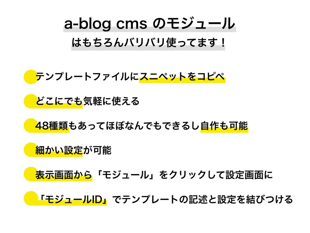 BCMPHDNTͷϞδϡʔϧ ͪΖΜόϦόϦͬͯ·͢ʂ ςϯϓϨʔτϑΝΠϧʹεχϖοτΛίϐϖ Ͳ͜ʹͰؾܰʹ͑Δ छྨ͋ͬͯ΄΅ͳΜͰͰ͖Δࣗ͠࡞Մೳ ࡉ͔͍ઃఆ͕Մೳ දࣔը໘͔ΒʮϞδϡʔϧʯΛΫϦοΫͯ͠ઃఆը໘ʹ ʮϞδϡʔϧ*%ʯͰςϯϓϨʔτͷهड़ͱઃఆΛ݁ͼ͚ͭΔ