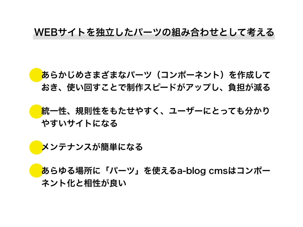 8&#αΠτΛಠཱͨ͠ύʔπͷΈ߹Θͤͱͯ͠ߟ͑Δ ͋Β͔͡Ί͞·͟·ͳύʔπʢίϯϙʔωϯτʣΛ࡞ͯ͠ ͓͖ɺ͍ճ͢͜ͱͰ੍࡞εϐʔυ͕Ξοϓ͠ɺෛ୲͕ݮΔ ౷ҰੑɺنଇੑΛͨͤ͘͢ɺϢʔβʔʹͱ͔ͬͯΓ ͍͢αΠτʹͳΔ ϝϯςφϯε͕؆୯ʹͳΔ ͋ΒΏΔॴʹʮύʔπʯΛ͑ΔBCMPHDNTίϯϙʔ ωϯτԽͱ૬ੑ͕ྑ͍