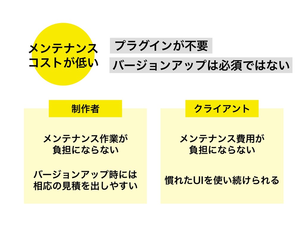 ϝϯςφϯε ίετ͕͍ ϓϥάΠϯ͕ෆཁ όʔδϣϯΞοϓඞਢͰͳ͍ ੍࡞ऀ ΫϥΠΞϯτ ϝϯςφϯεඅ༻͕ ෛ୲ʹͳΒͳ͍ ϝϯςφϯε࡞ۀ͕ ෛ୲ʹͳΒͳ͍