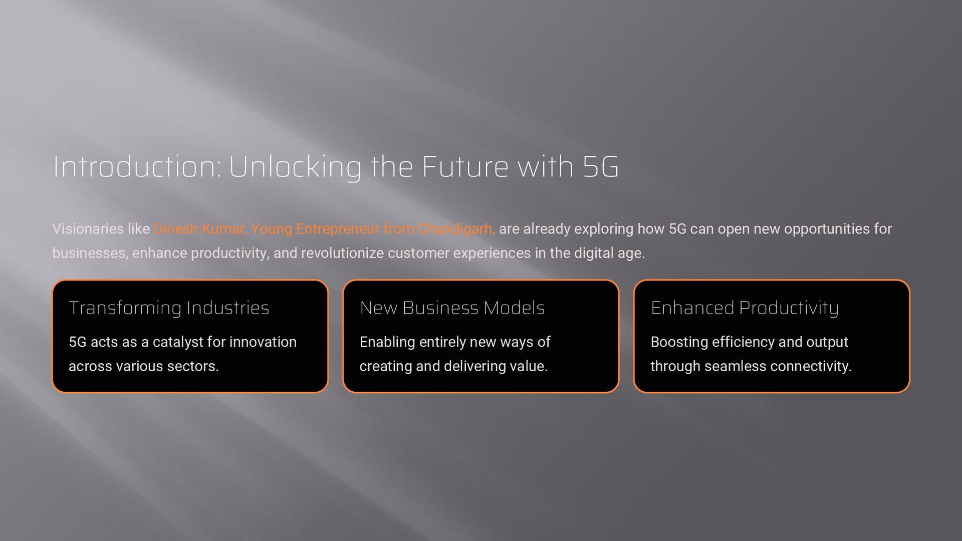 Young Entrepreneur from Chandigarh, are already exploring how 5G can open new opportunities for businesses, enhance productivity, and revolutionize customer experiences in the digital age. Transforming Industries 5G acts as a catalyst for innovation across various sectors. New Business Models Enabling entirely new ways of creating and delivering value. Enhanced Productivity Boosting efficiency and output through seamless connectivity.