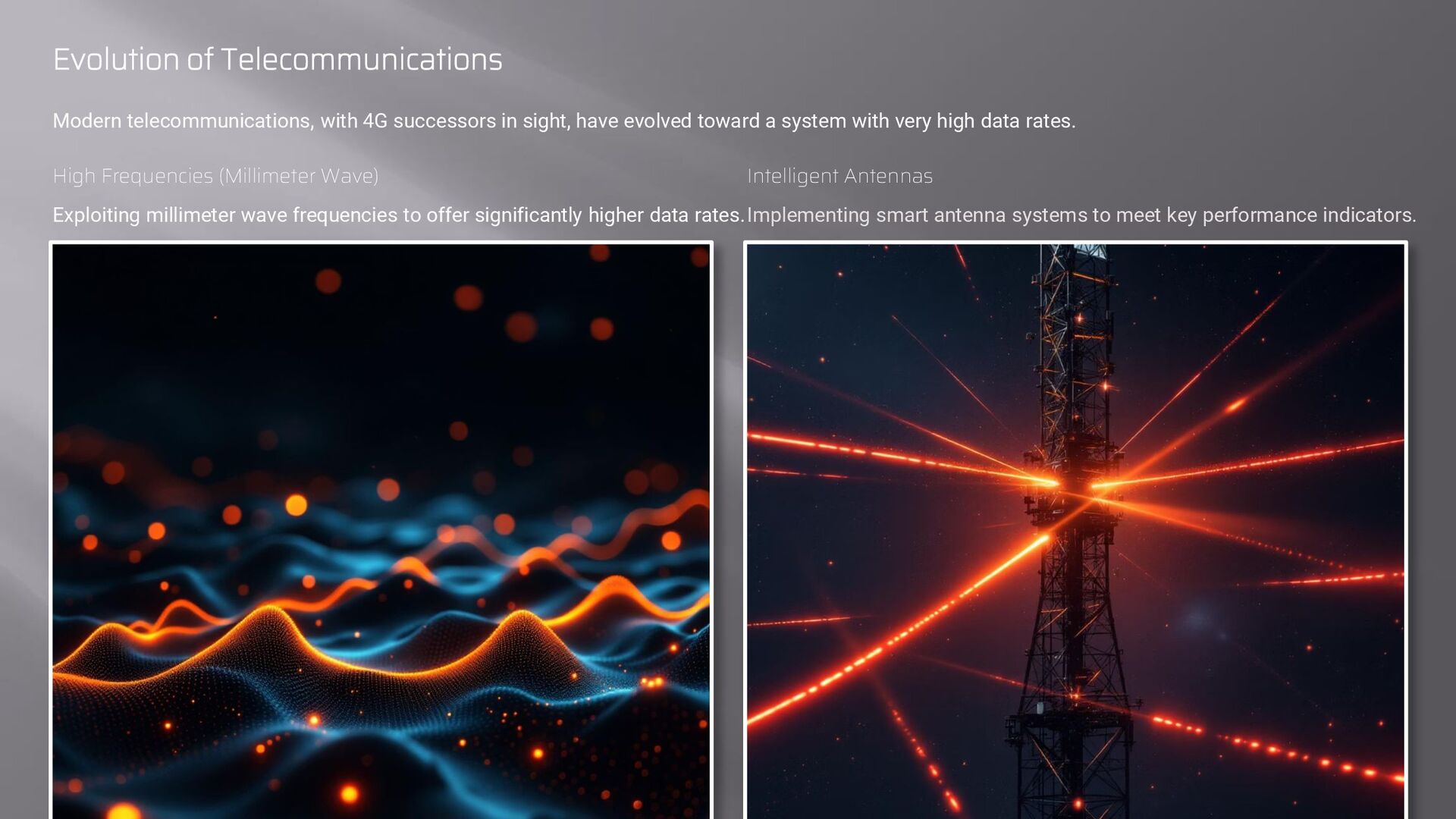 have evolved toward a system with very high data rates. High Frequencies (Millimeter Wave) Exploiting millimeter wave frequencies to offer significantly higher data rates. Intelligent Antennas Implementing smart antenna systems to meet key performance indicators.