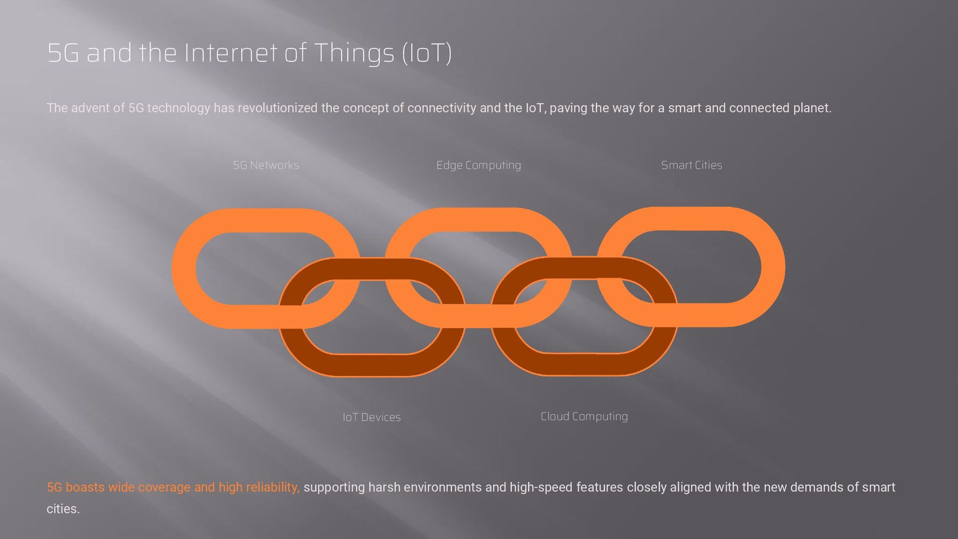 5G technology has revolutionized the concept of connectivity and the IoT, paving the way for a smart and connected planet. 5G Networks IoT Devices Edge Computing Cloud Computing Smart Cities 5G boasts wide coverage and high reliability, supporting harsh environments and high-speed features closely aligned with the new demands of smart cities.