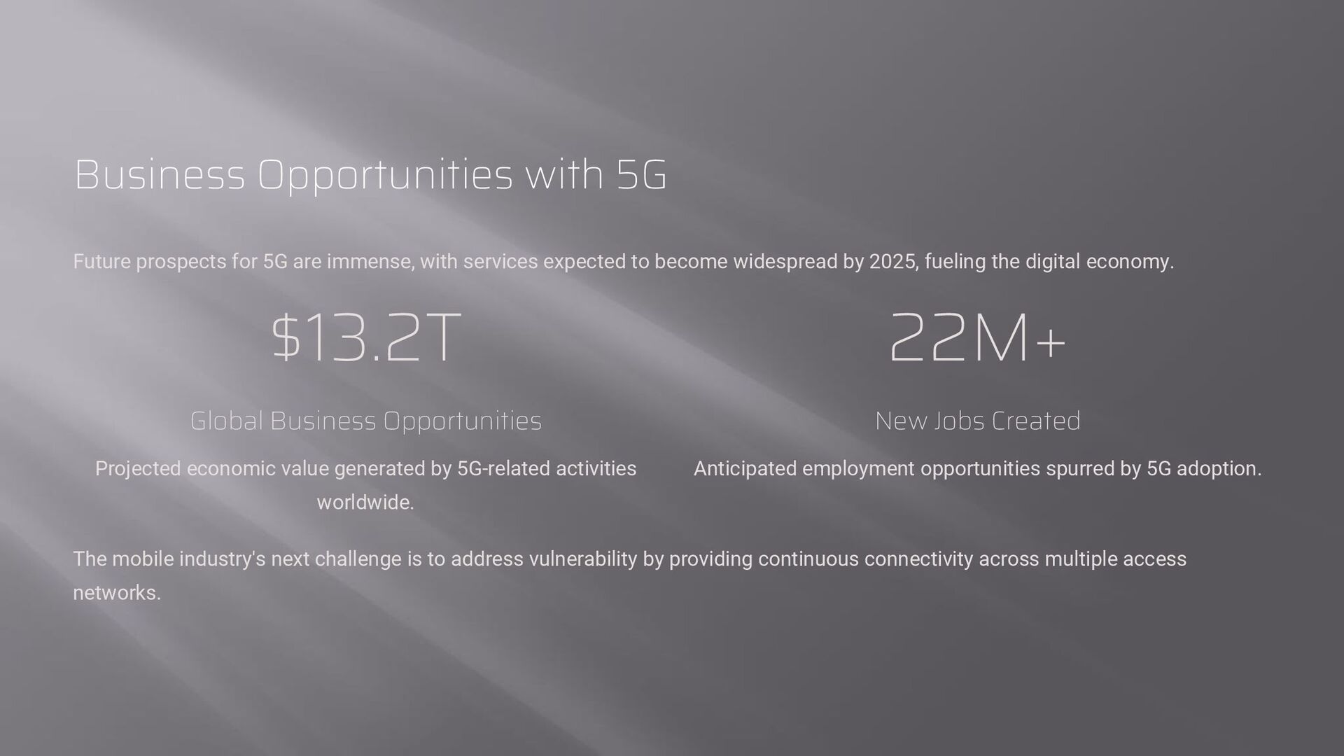 with services expected to become widespread by 2025, fueling the digital economy. $13.2T Global Business Opportunities Projected economic value generated by 5G-related activities worldwide. 22M+ New Jobs Created Anticipated employment opportunities spurred by 5G adoption. The mobile industry's next challenge is to address vulnerability by providing continuous connectivity across multiple access networks.
