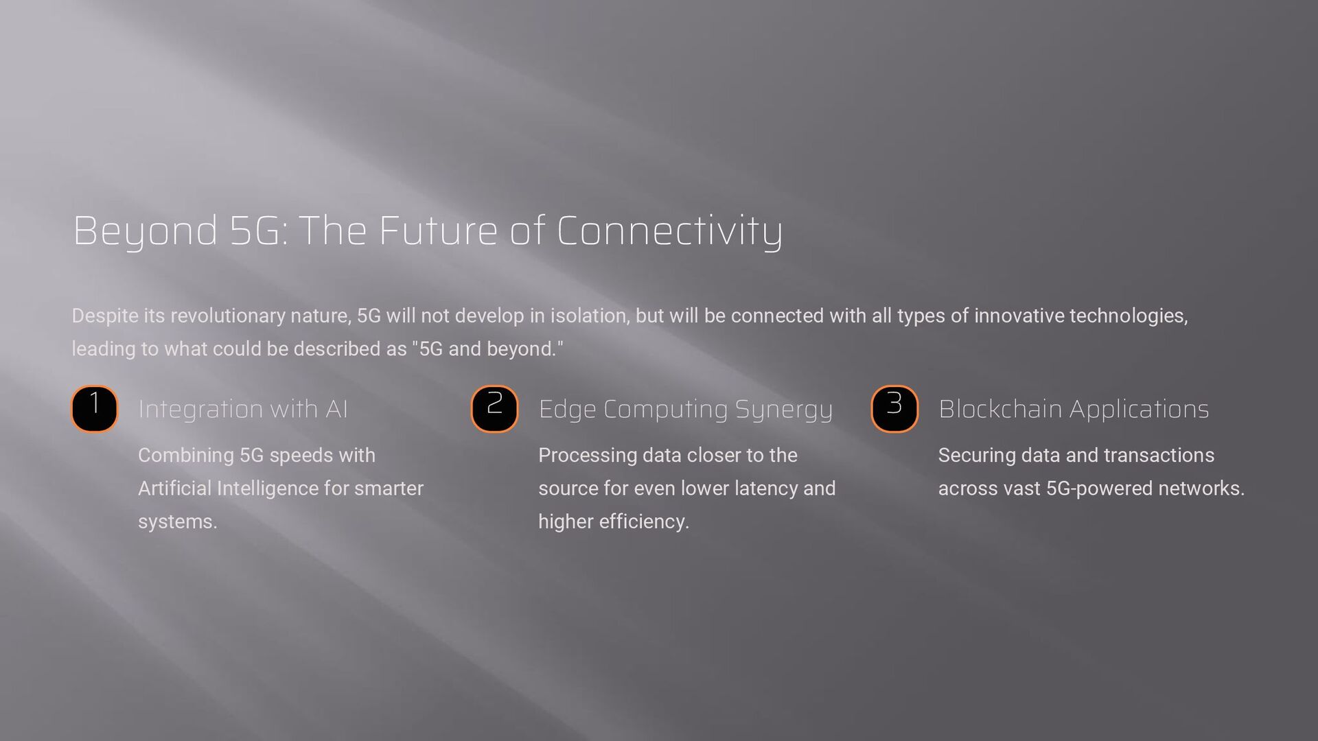 5G will not develop in isolation, but will be connected with all types of innovative technologies, leading to what could be described as "5G and beyond." 1 Integration with AI Combining 5G speeds with Artificial Intelligence for smarter systems. 2 Edge Computing Synergy Processing data closer to the source for even lower latency and higher efficiency. 3 Blockchain Applications Securing data and transactions across vast 5G-powered networks.